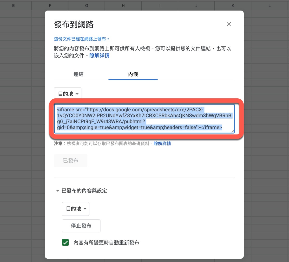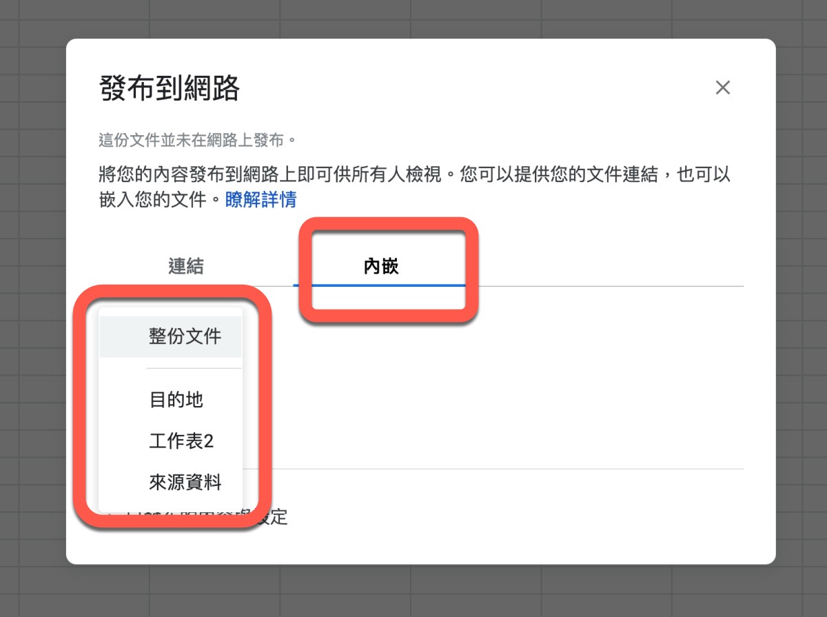 接下來選擇內嵌,以及想要發佈出去的內容是哪些,可以整份文件,也可以單一個工作表,下方按下發佈。