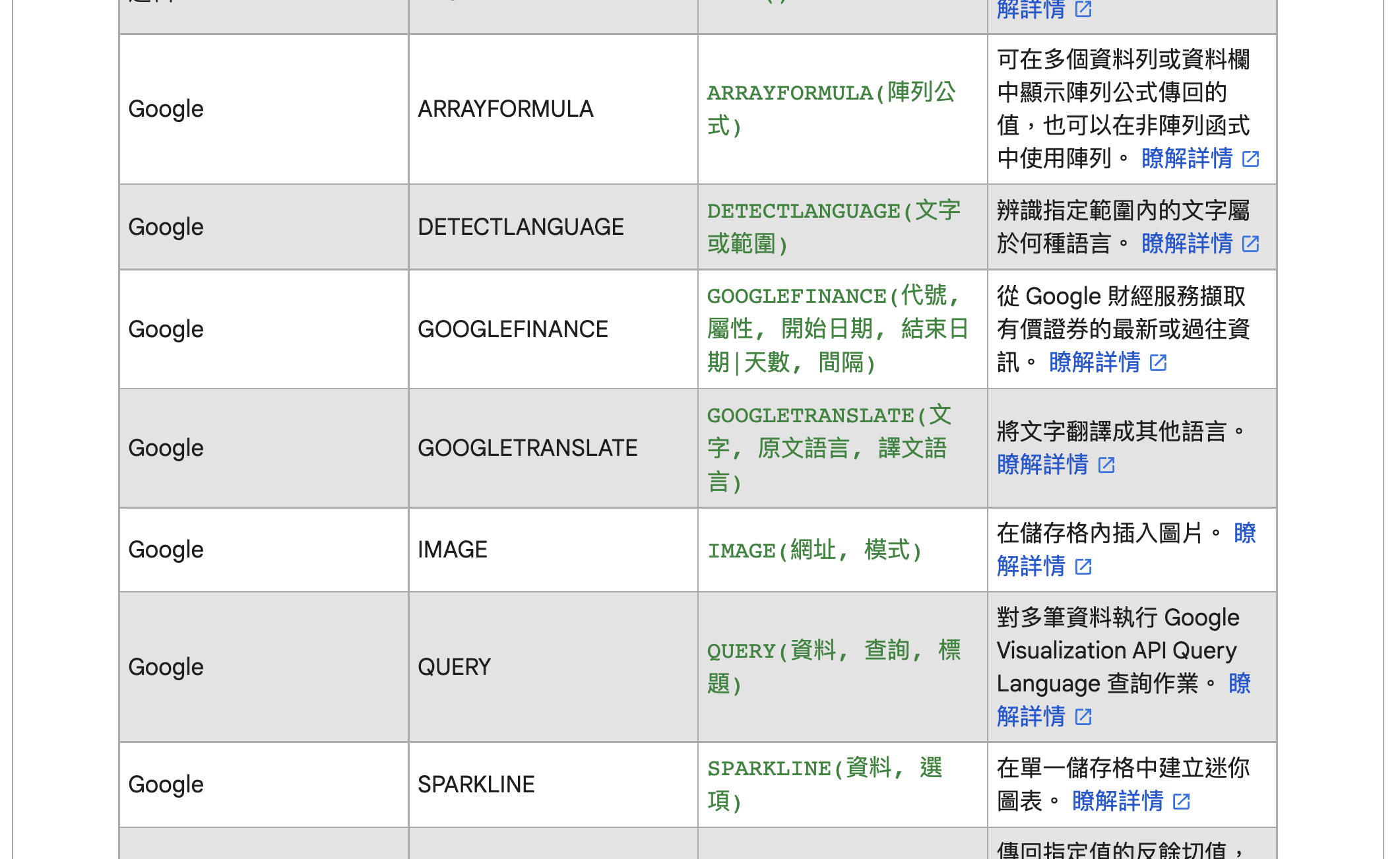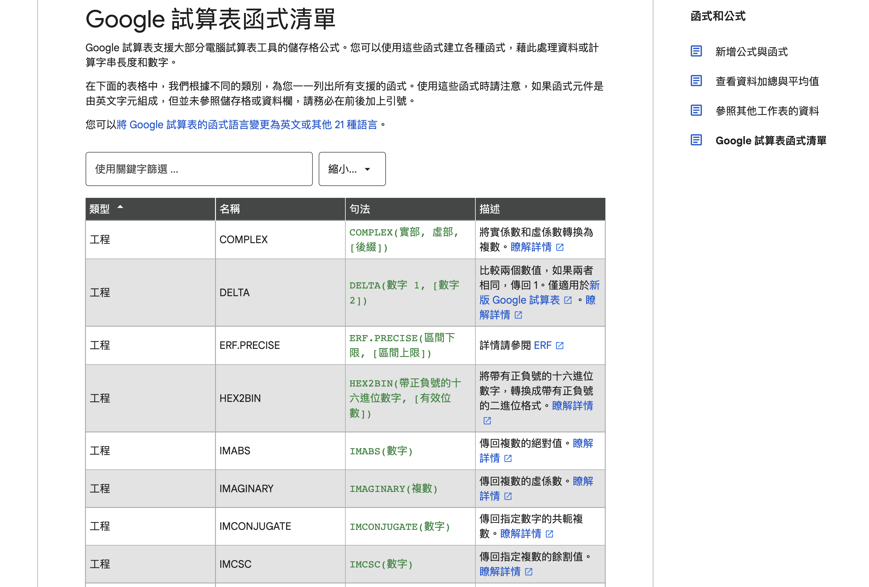 Google 試算表函數列表:https://support.google.com/docs/table/25273?hl=zh-Hant