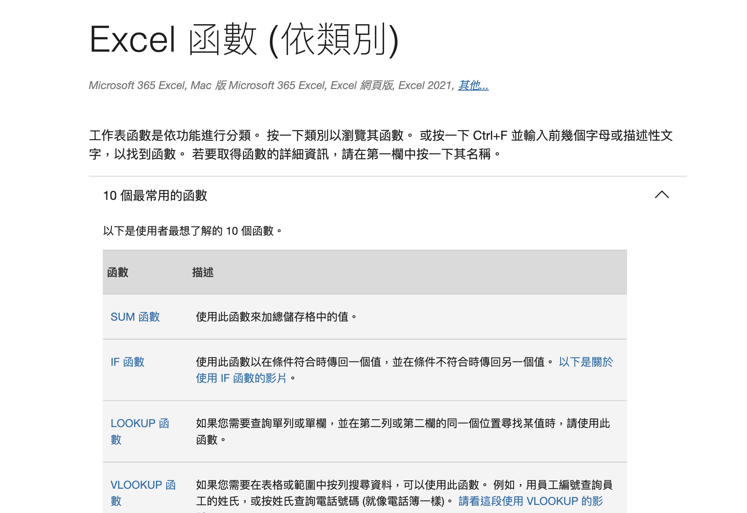 點擊進去就會有相關說明,也有每個函數支援的 Office 版本。