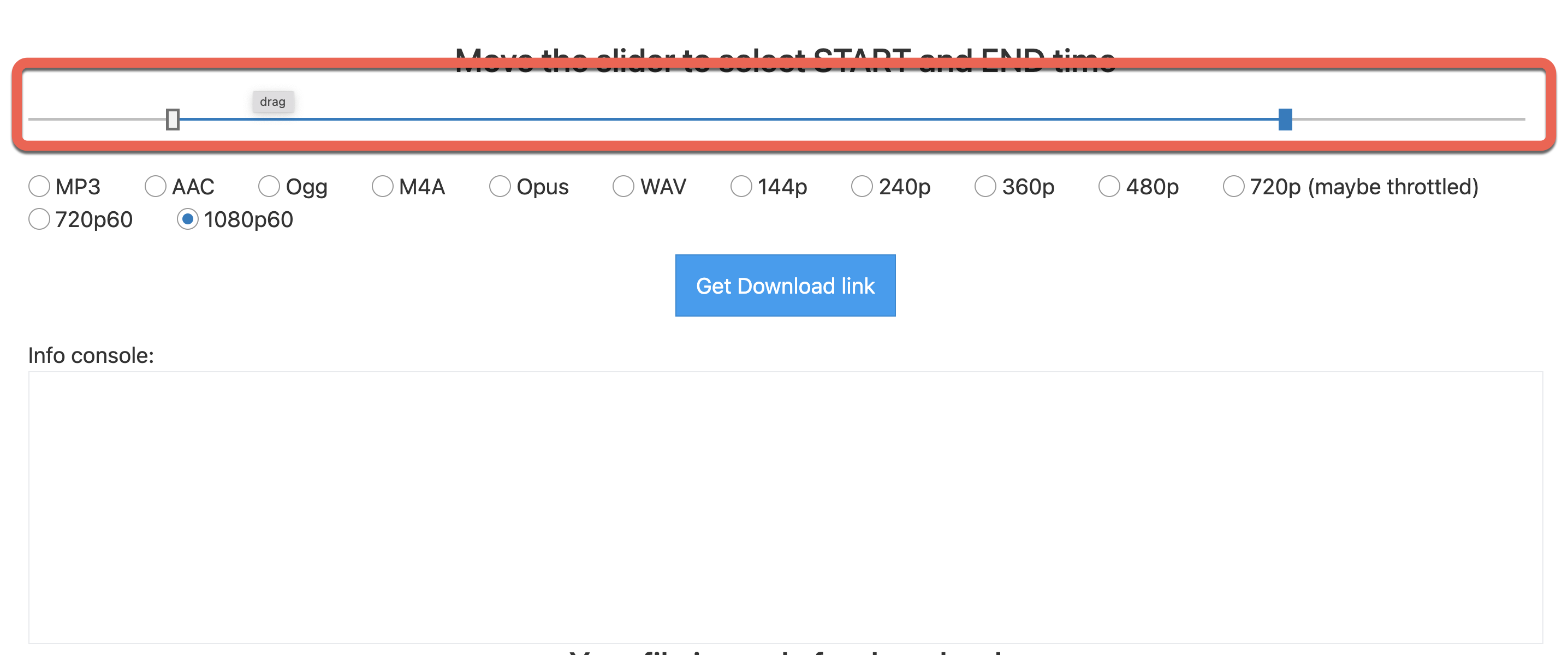 偵測完後,在下方會有一條可以拖曳影片起始跟結尾的時間點,也就是你想要擷取下來的片段範圍,然後再選擇要輸出的格式,按下 Get Download link 等待轉檔。