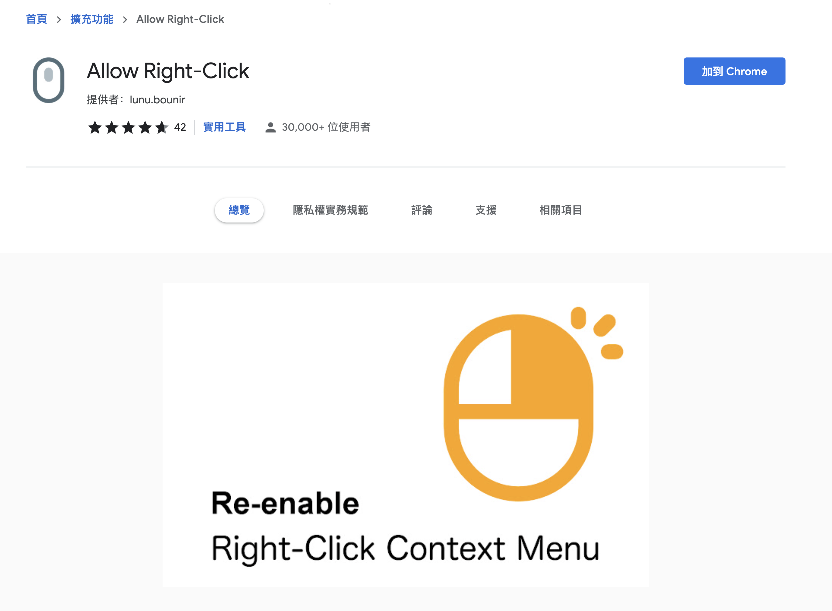 Allow Right-Click 安裝:Chrome、Edge、Firefox、Opera依照你的瀏覽器下載看看吧,以 Chrome 為例,按加到 Chrome。