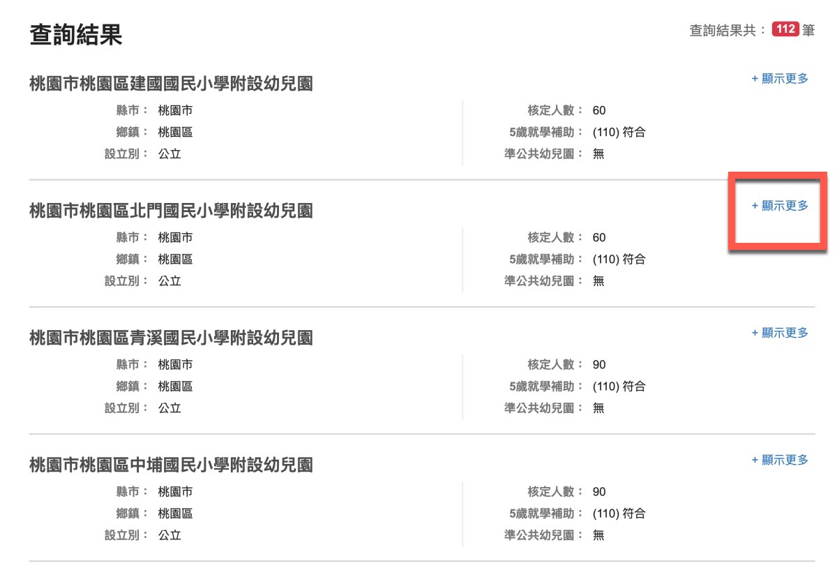往下看到查詢結果後,就可以針對想看的幼兒園後方點擊顯示更多。