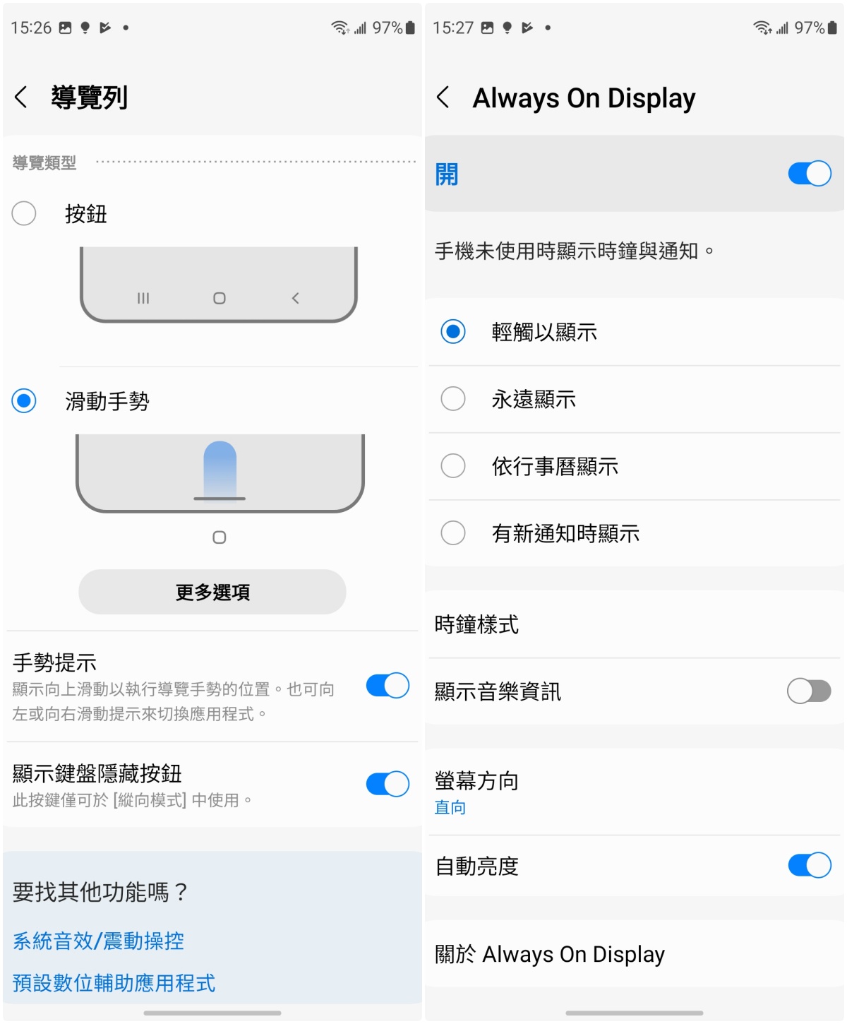 記得可以在導覽列的設定中去開啟,另外也可以設定鎖定畫面時的 Always On Display 的內容,可以幫助你減少解鎖螢幕的次數,有些資訊不用開啟就能先查看。