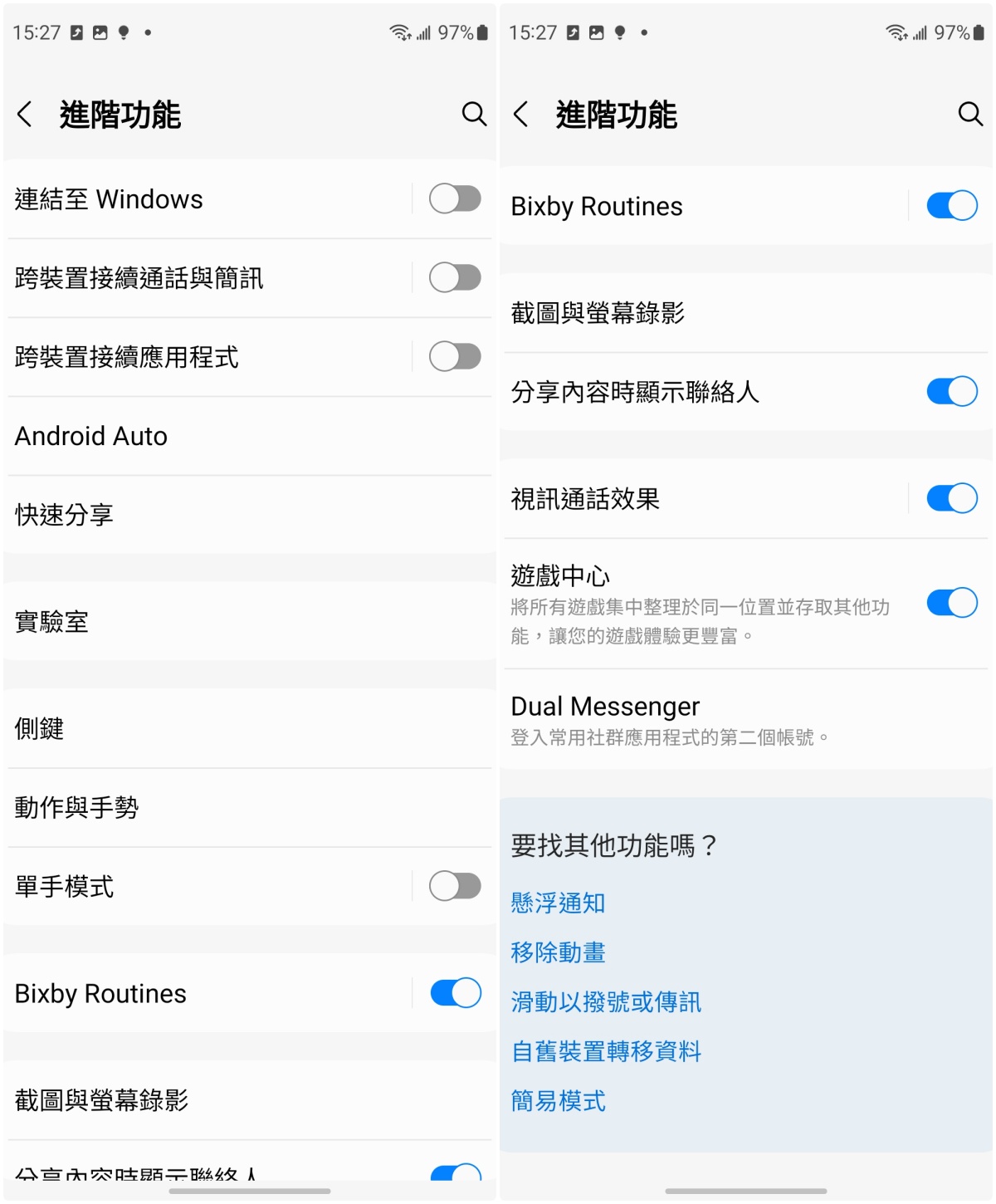 更多功能還有像是與 Windows 連結的功能:跨裝置接續通話與簡訊、跨裝置接續應用程式,然後和汽車連結的 Android Auto、遊戲中心、Dual Messenger 分身功能等。