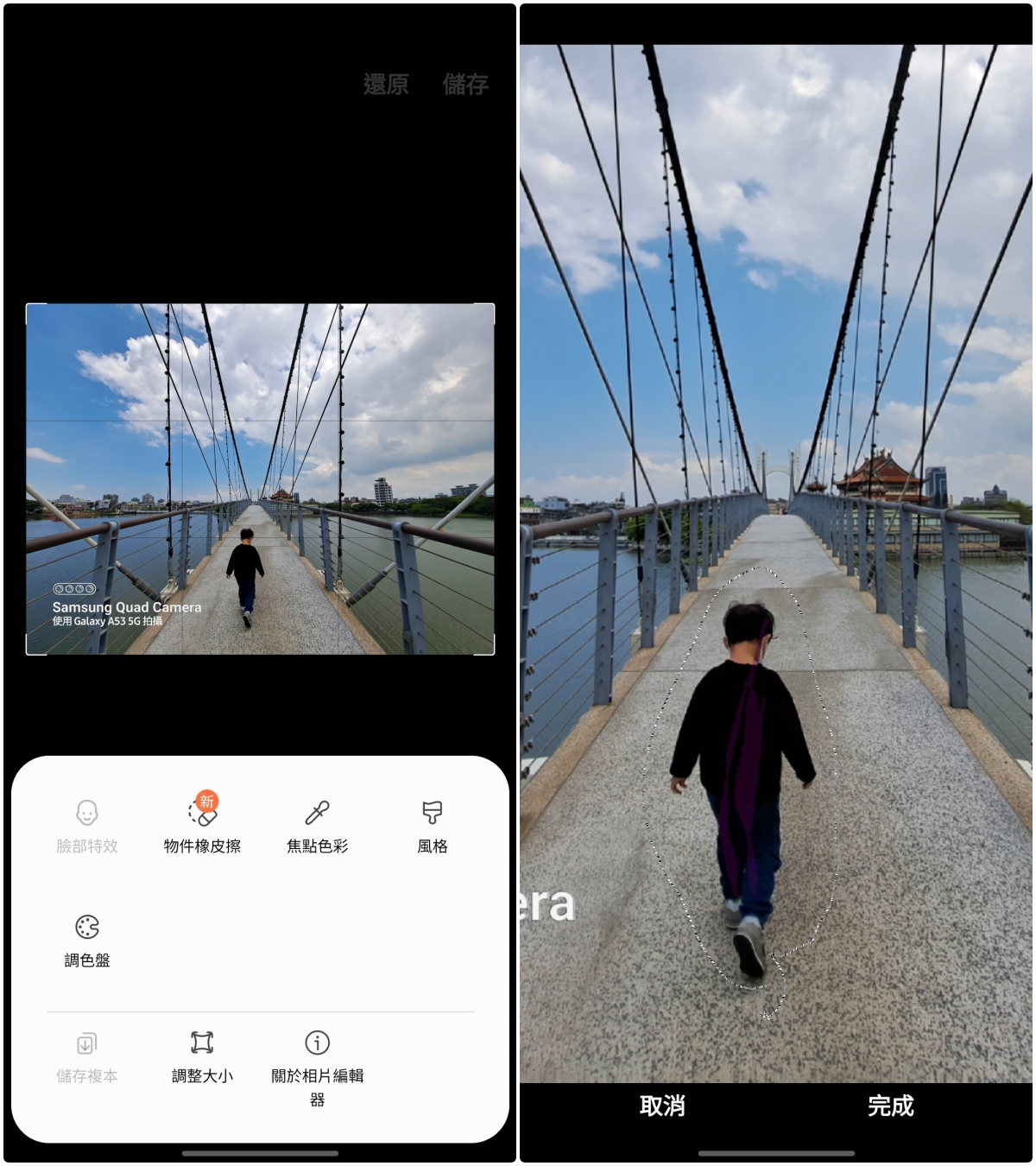 拍照完的成像如果有路人甲乙丙丁的話,也不用擔心,在 Galaxy A53 5G 的相片編輯功能中,這次加入了「物件橡皮擦」的功能,點擊後直接框選要移除的物件(可放大照片後再圈會比較精細哦)。