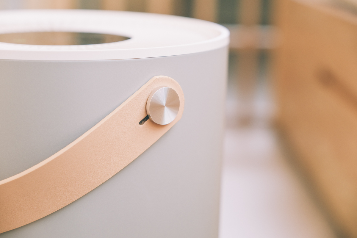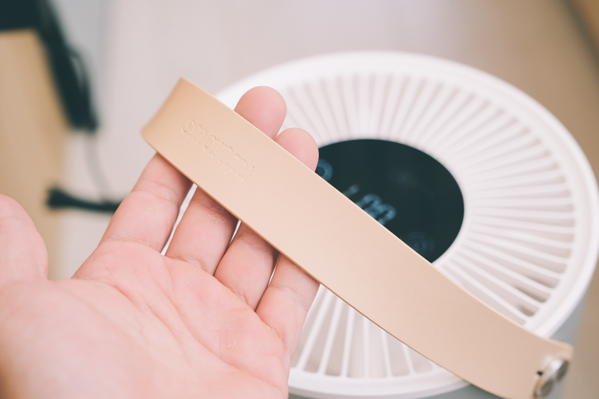 而這皮革提帶在側邊用了這樣的金屬鎖扣來點綴,你會覺得這很像是在用做皮件的方式來設計,完美的結合在空淨機的身上。