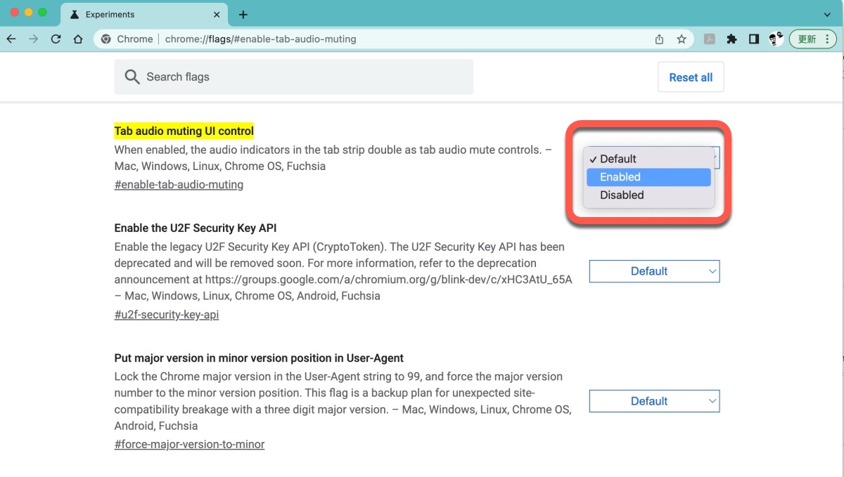 chrome://flags/#enable-tab-audio-muting在 Tab audio muting UI control 這個設定項目改成 Enabled,接著重開 Chrome 瀏覽器。