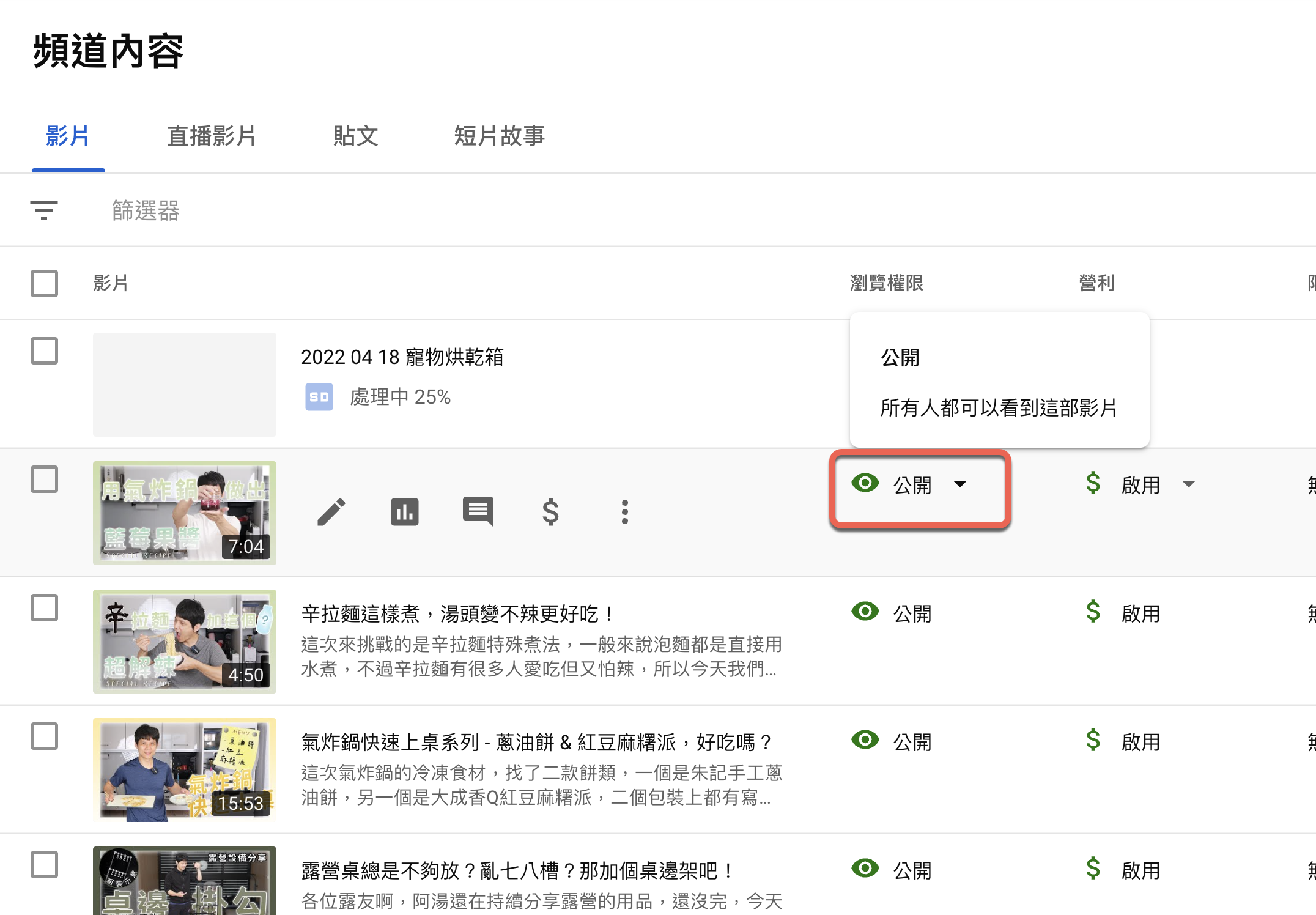 進入你頻道的 YouTube 工作室,然後選擇要分享出去的私人影片,在瀏覽權限那裡下拉。
