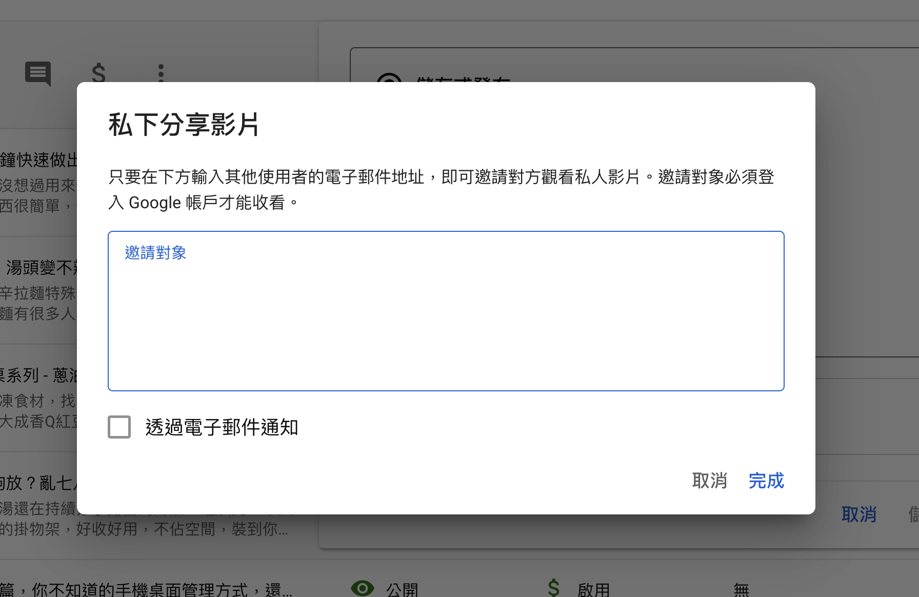 選擇後就可以輸入要分享給對方的 Email,這私人影片觀看必須要登入 Google 帳號,所以請確認你想要分享的人是有 Google 帳號的,很簡單吧,去試看看吧。