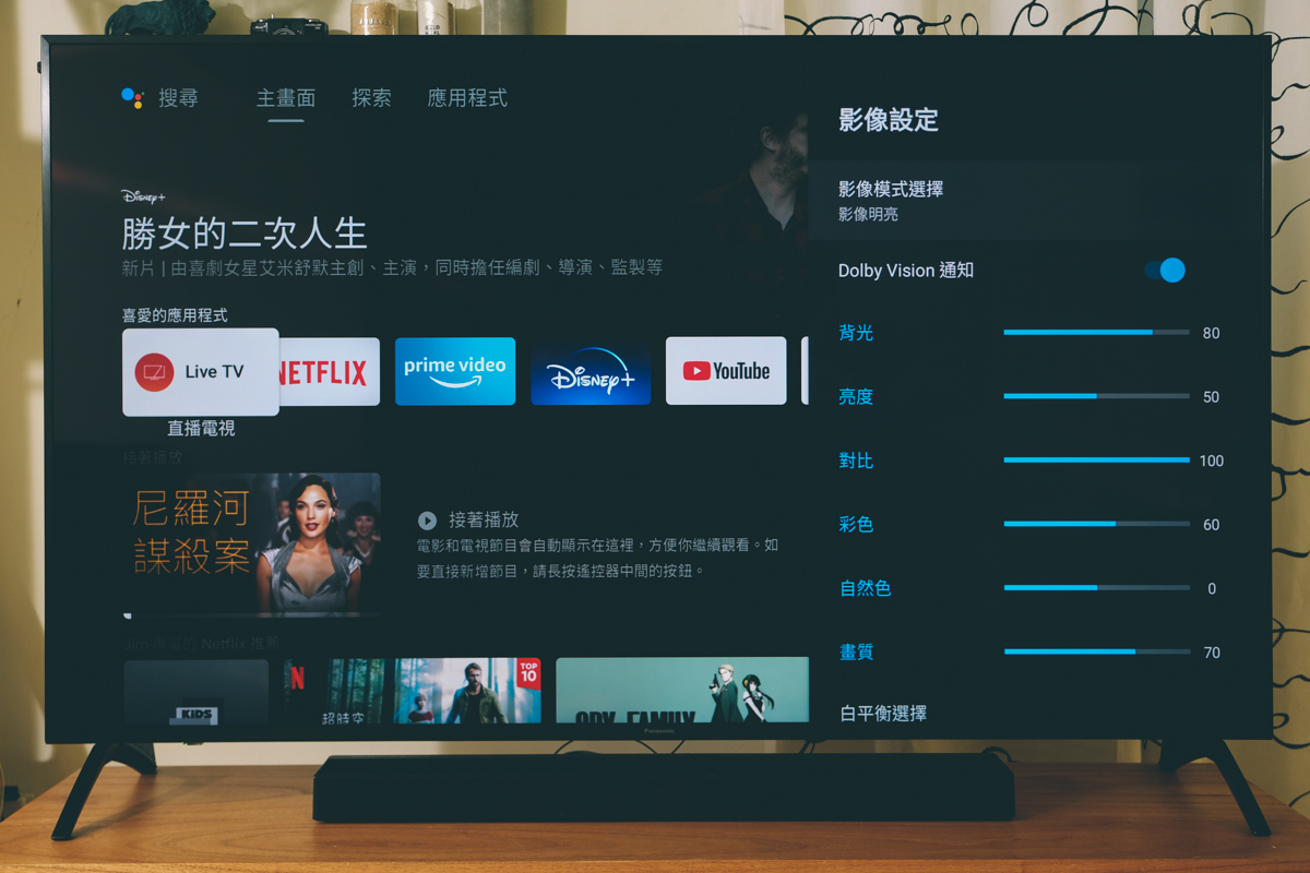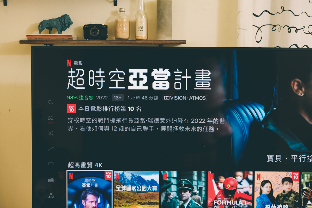 Panasonic 這款 4K 電視還支援 Dolby VISION 及 Dolby Atmos,以 Netflix 來說,在影片片名下方都會顯示 ,有支援什麼,像這部影片同時支援 Dolby VISION(杜比視界)及 Dolby Atmos(杜比全景聲),只要你看的內容有支援這二種技術之一,都會自動開啟且在畫面顯示。