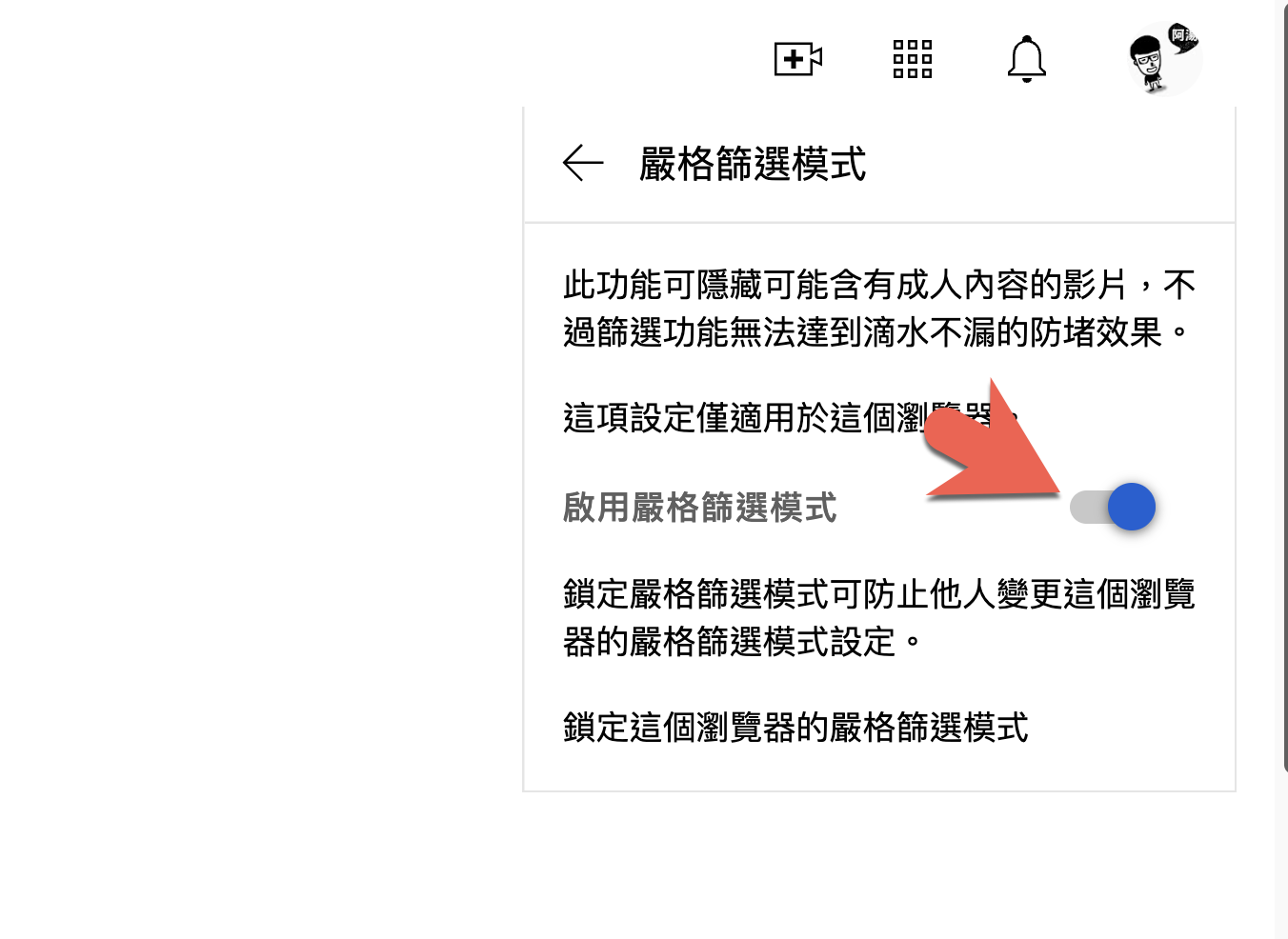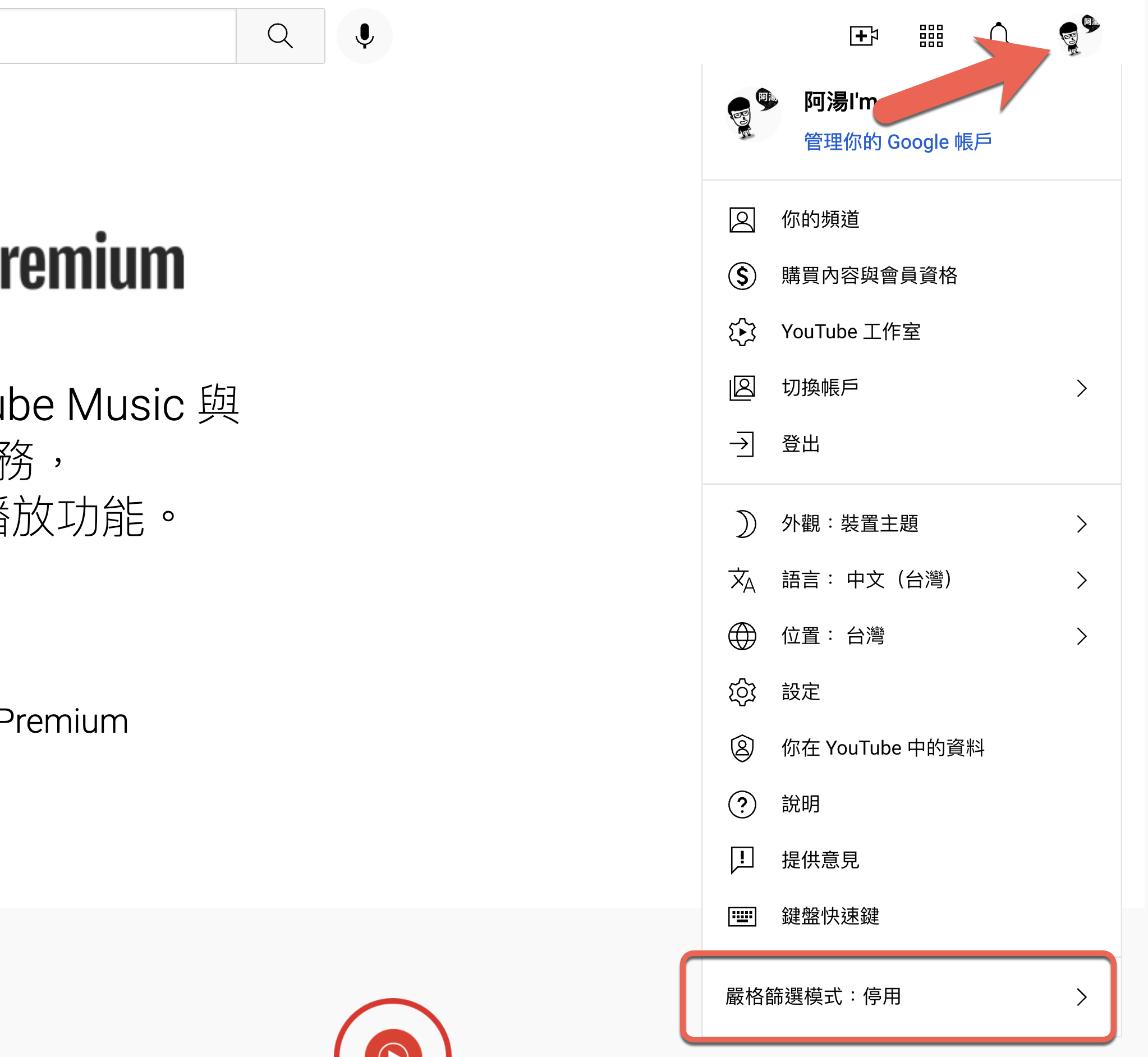 這個選項開啟都是針對設備,不是跟隨帳號,所以阿湯這邊分成網頁版跟 APP 版教學。 首先是網頁版,先在右上角點擊自己的頭像,然後最下面就可以找到嚴格篩選模式。