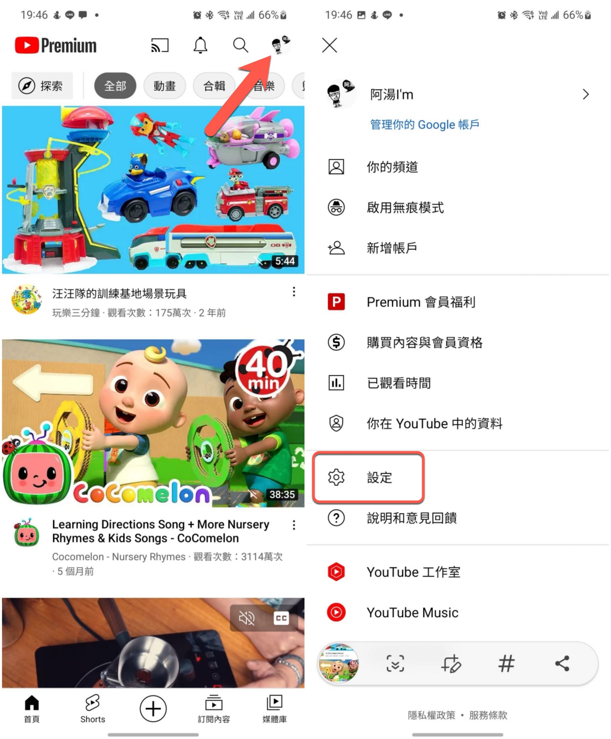 再來是 APP 版本,如果你用的是手機的 YouTube APP,那麼一樣的,先點擊右上角的頭像,然後進入「設定」。