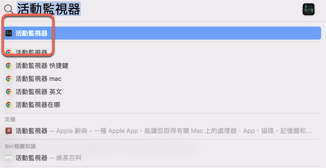 首先按下 Cmd 鍵 ⌘ + 空白鍵,叫出 Spotlight 搜尋框,直接輸入活動監視器搜尋,然後執行他,或你要在 Launch Pad 裡找也是可以的。