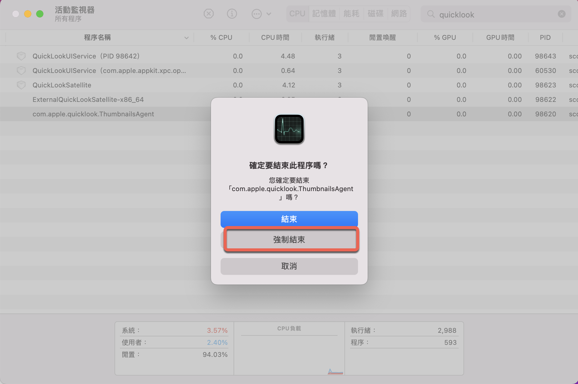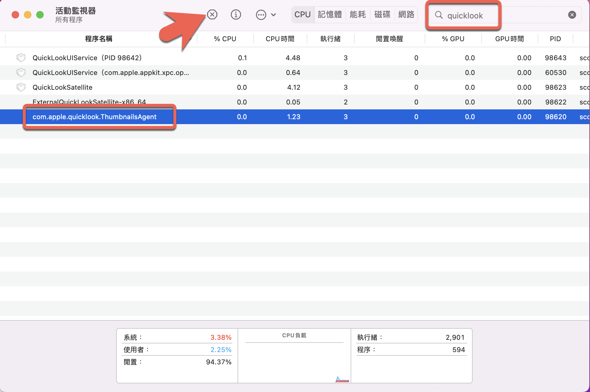 進入活動監視器後,在右上搜尋 quicklook 會有幾個程序名稱差不多的,請找到「com.apple.quicklook.ThumbnailsAgent」,選擇後按下上方的 X。