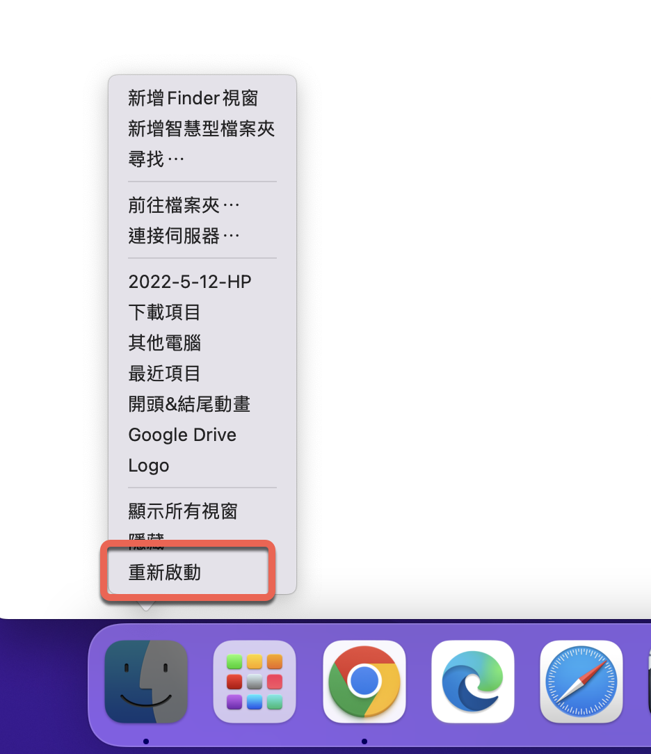 最後按住鍵盤的 Option 鍵,然後滑鼠右鍵 Finder,點擊「重新啟動」,接下來你的圖示縮圖預覽應該就迎刃而解了。