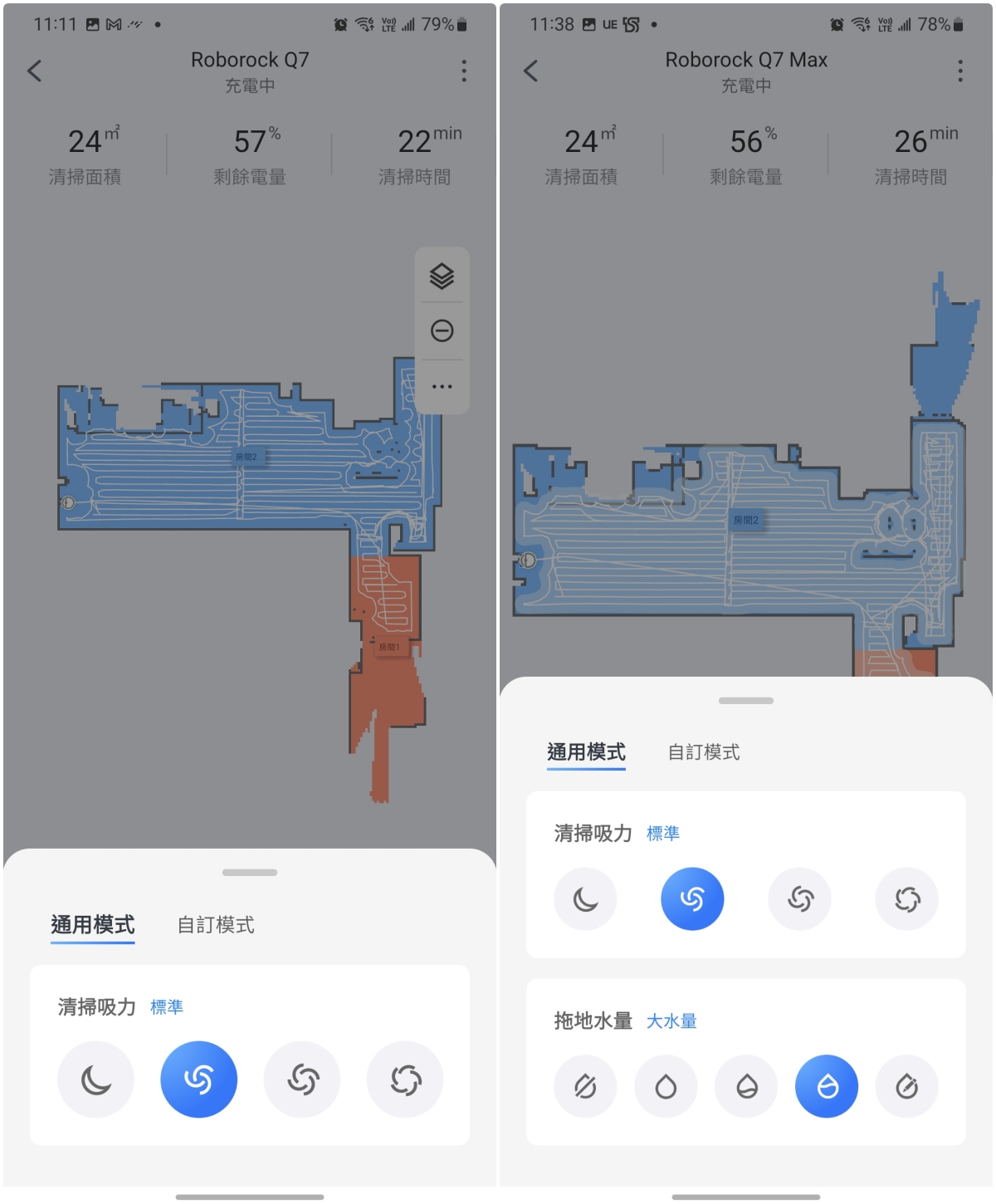 在模式設定的地方,由於 Q7 Max+ 多了電控水箱,因些我們可以額外的設定拖地的水量,或是單純拖地。