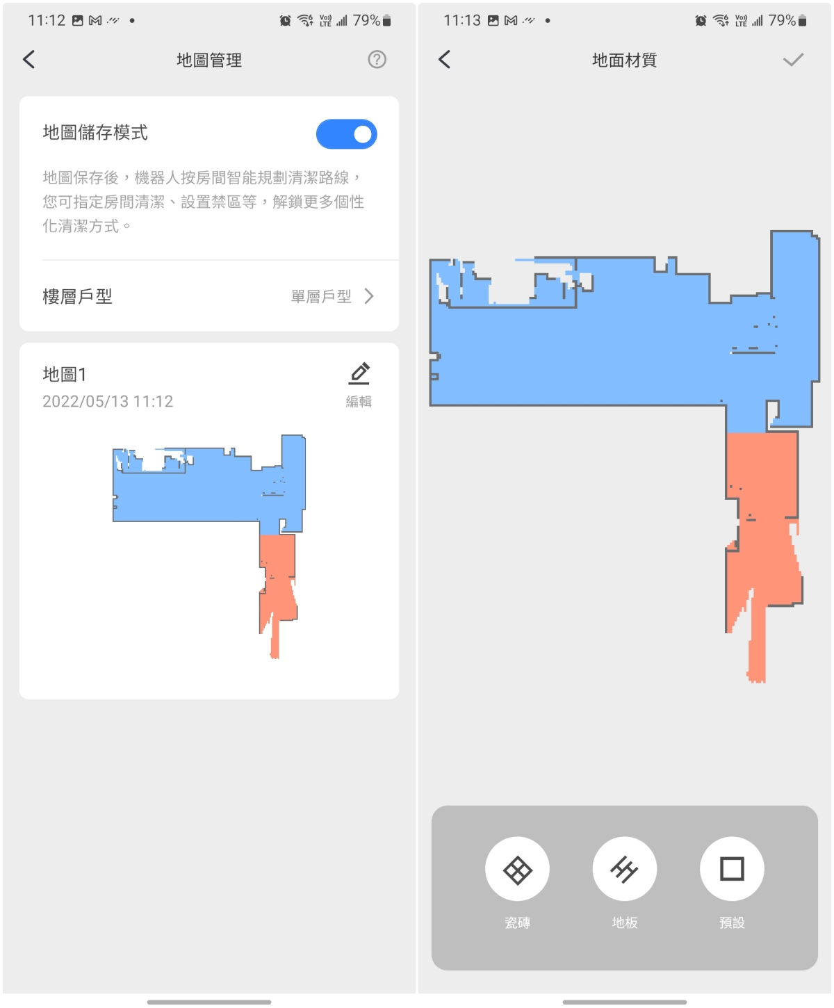 除了針對不同區域設定地面材質外,透過地圖儲存模式,就能支援像透天厝這種多樓層的建築,不同樓層可以建構並各別保存地圖,即便只有一台掃地機器人也能在不同樓層中穿梭自如。