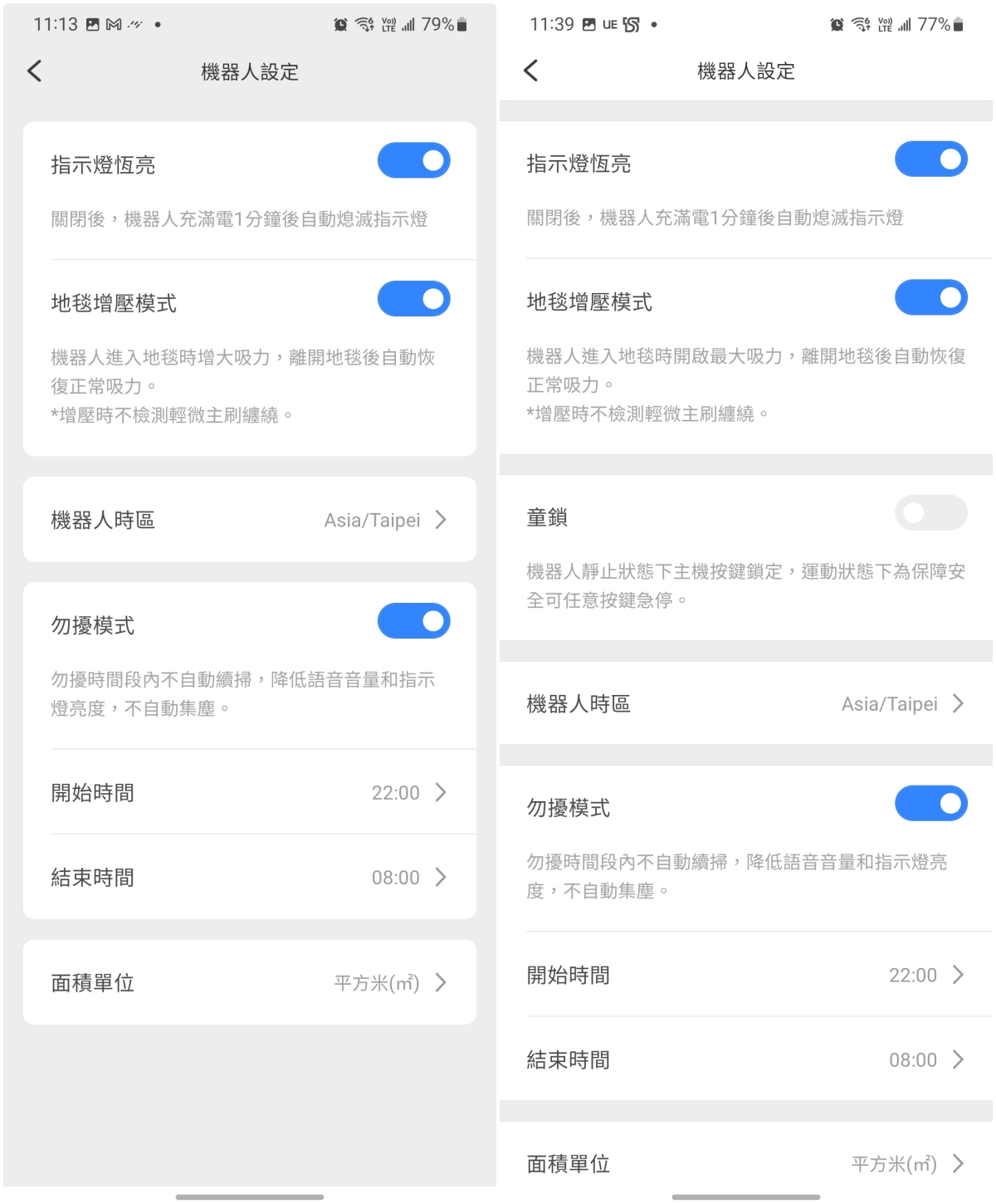 而機器人設定中,最大差異就在童鎖的部份,Q7 Max 比起 Q7 多了兒童安全鎖的功能,除了透過主機上的按鈕設定外,也能透過 APP 設定及解除。