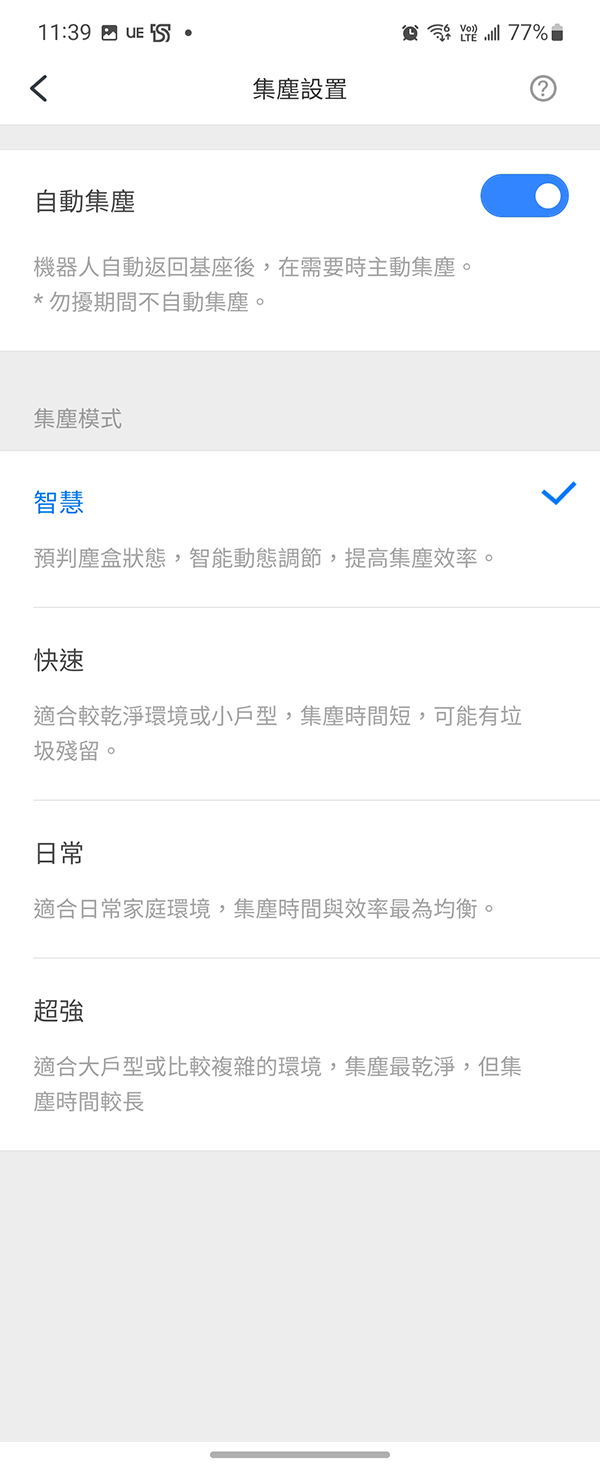 自動集塵座也能在 APP 中設定集塵的模式,基本上都設定為智慧就夠了,但如果家中坪數很大,每天都要清掃的話,那就建議強力選下去就對了。