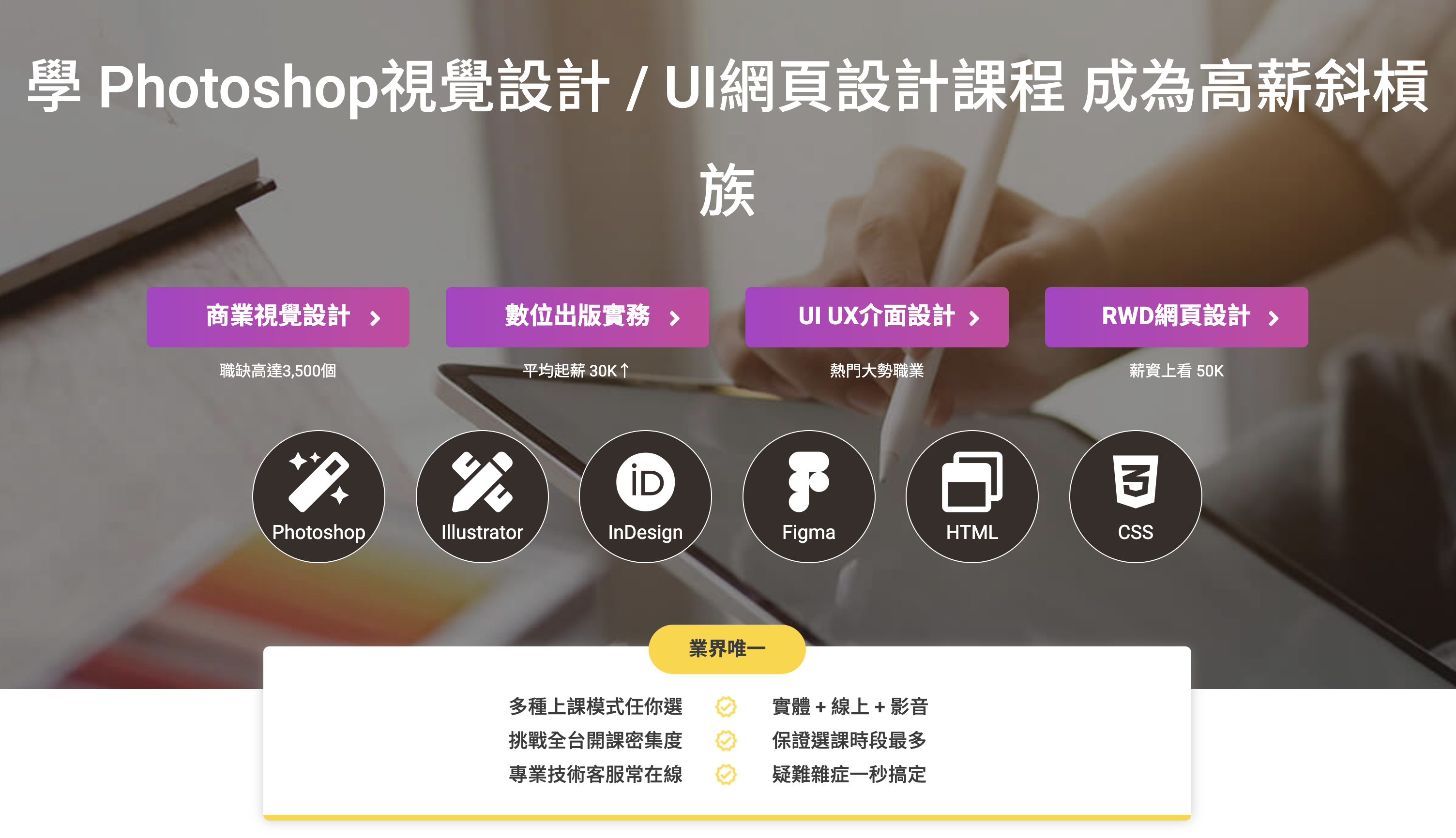 講了這麼多,可以學到的有哪些,在四大類設計課程,其中包括 Photoshop、Illustrator、InDesign、Figma、HTML 及 CSS,由淺入深,全方位的內容,不論你是想要學哪一類,我想只要你認真的跟著課程全部上完後,就像吃了 50 年大還丹一樣,功力大增。