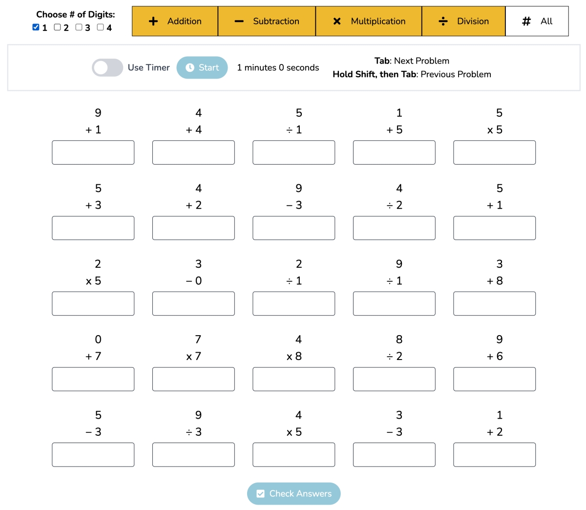 網站:https://robomath.tech/進入網站後,上方那一排可以選擇練習幾位數,以及要練習哪些運算式,可以任選加減乘除,網頁重整,或是重新選擇選項,就會自動刷新題目。