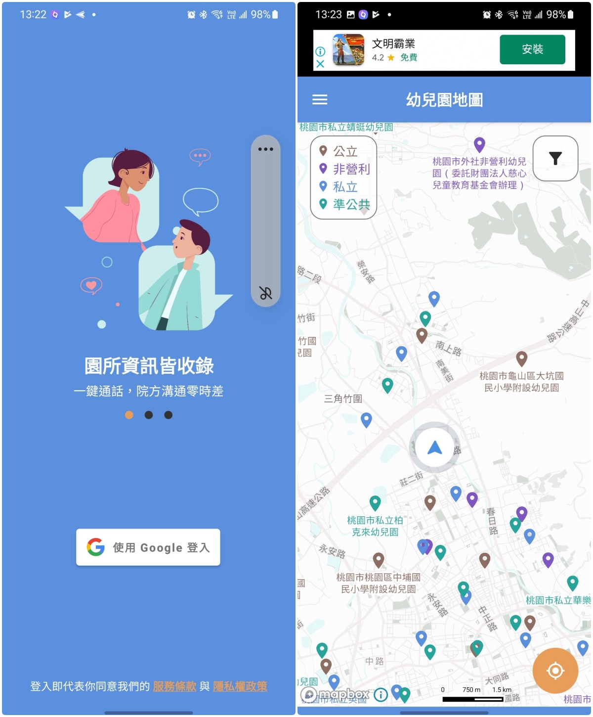 首先這款 APP 需要 Google 帳戶登入,登入後就可以直接查看,不同顏色的標記區分了公立、非營利、私立以及準公共。