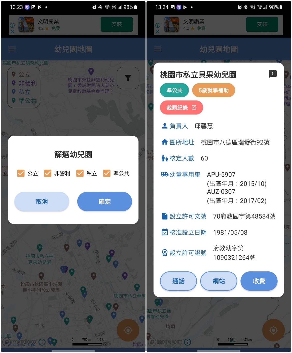 點擊右上角的篩選就可以篩選幼兒園的類別,而點擊每家幼兒園,都可以看到基本的設立資訊。