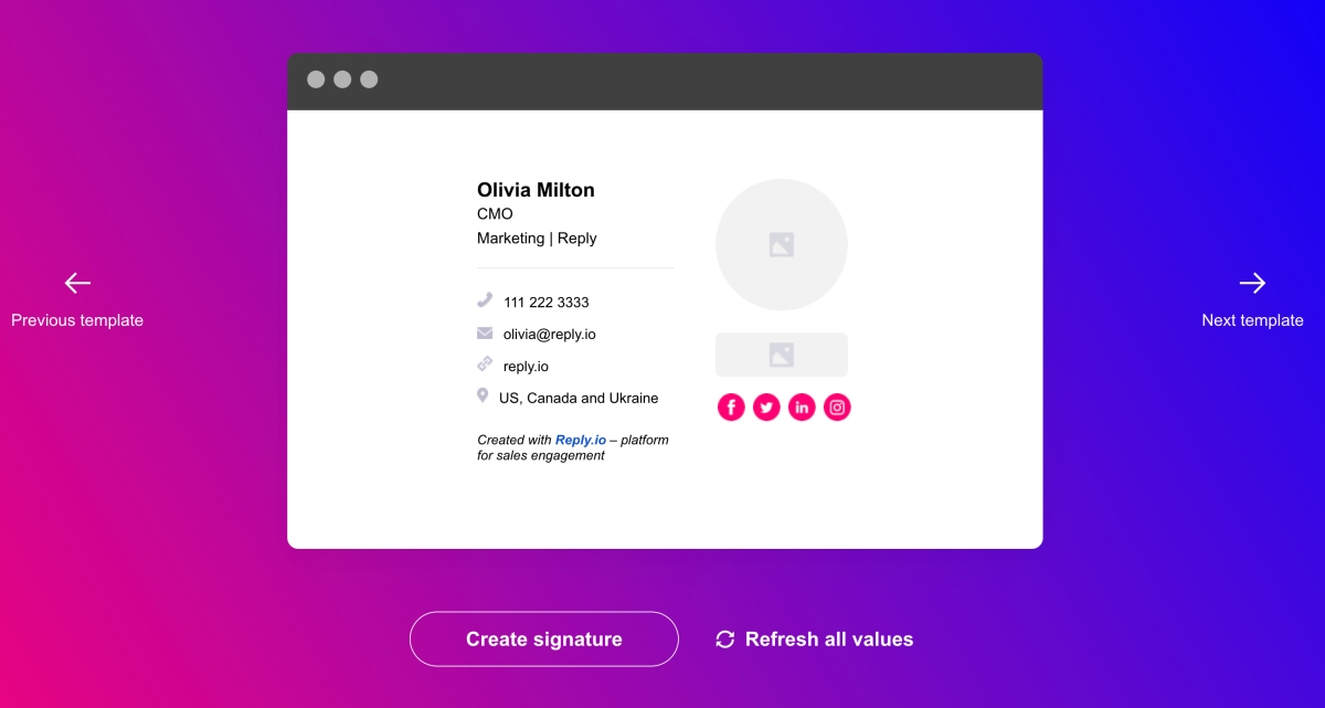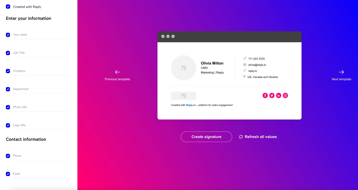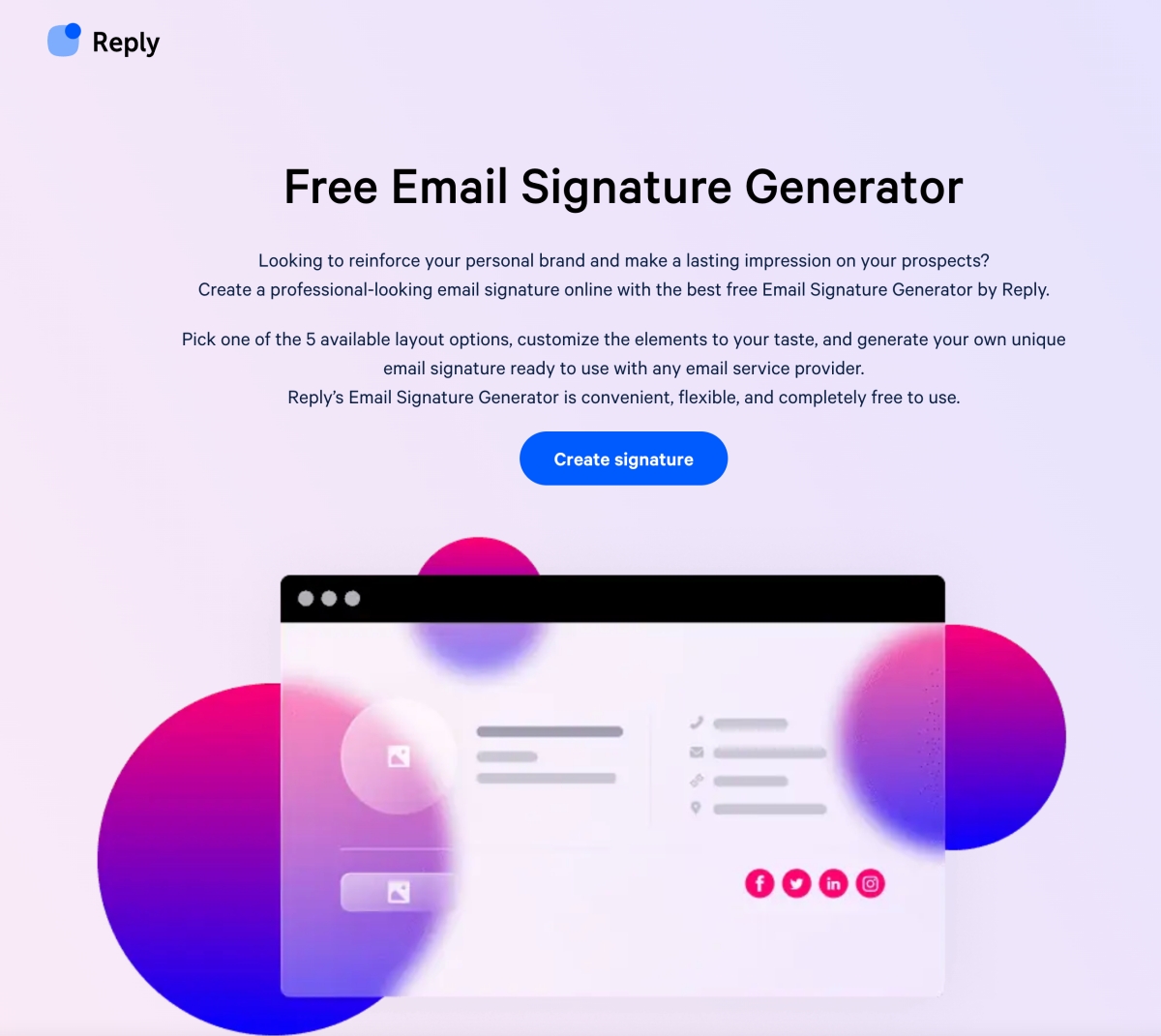 網站:https://reply.io/email-signature-generator/進入網站後,這不需要註冊,直接點擊 Create signature 開始製作。