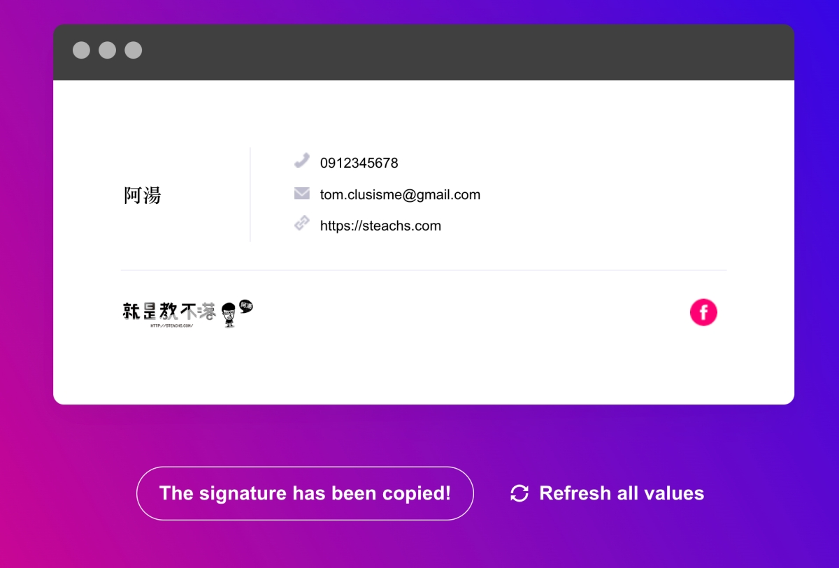 阿湯就先隨便選擇一個,設定好後按下 Create signature,就會複製到你的剪貼簿了。