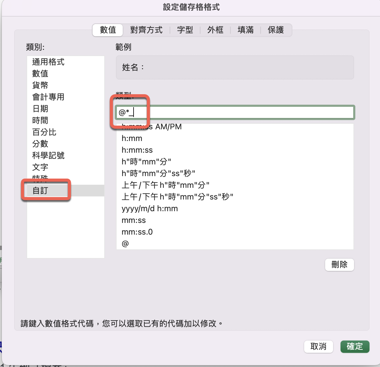 這時選擇自訂格式,輸入內容「@*_」簡單的說就是保持原欄位後在後方加上底線。