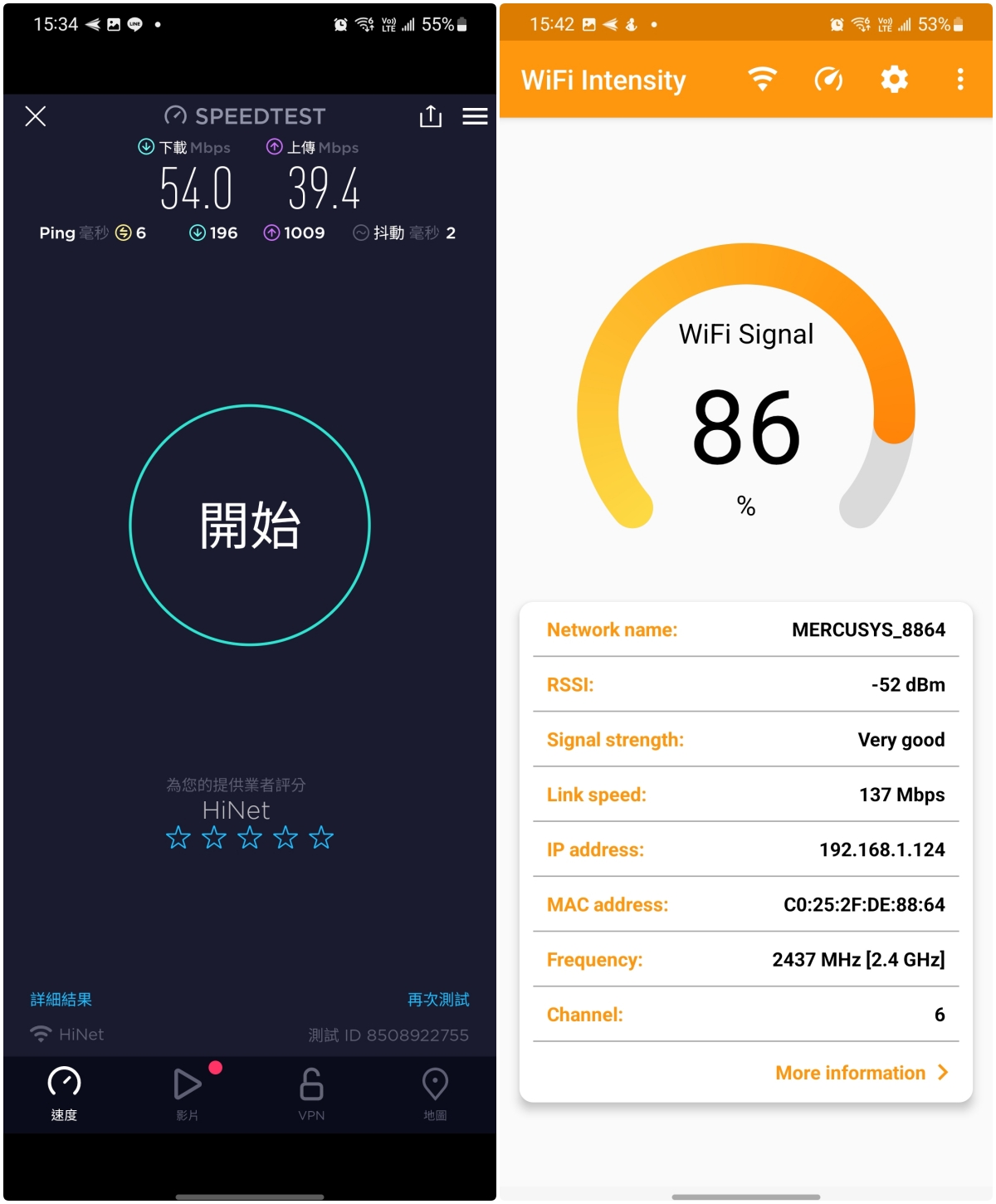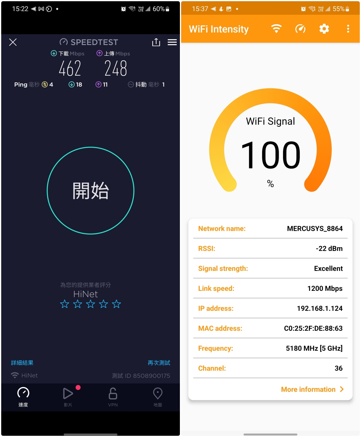 - Wi-Fi 訊號強度:-52dBm