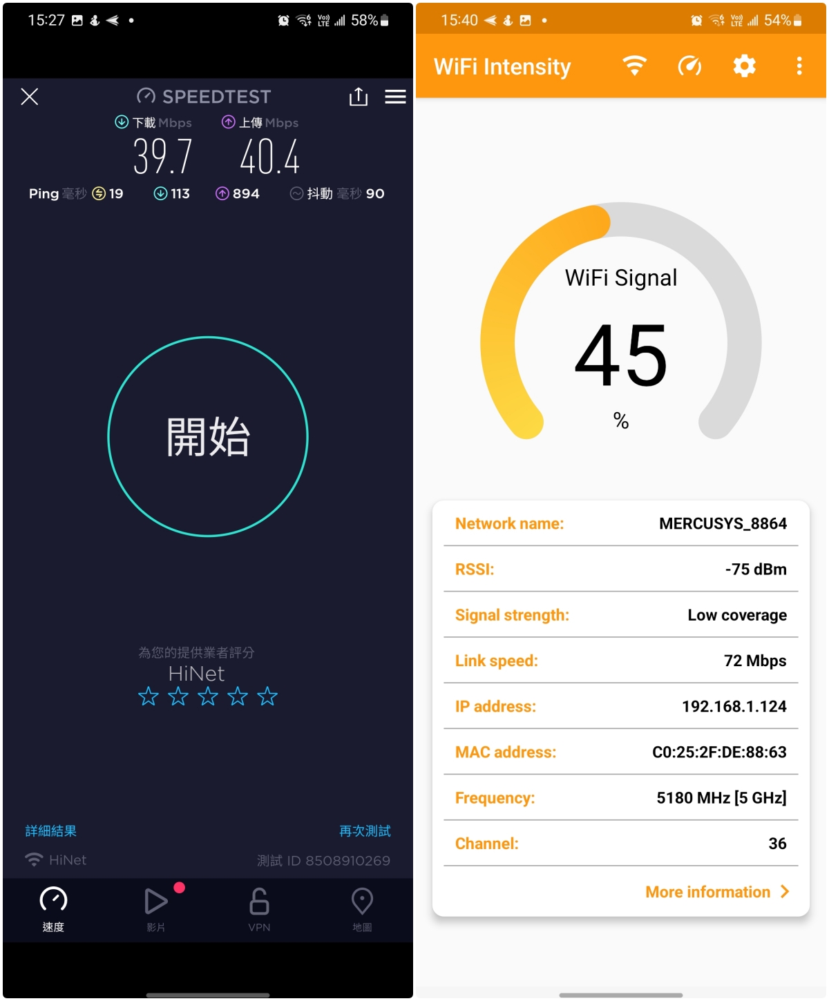 - Wi-Fi 訊號強度:-58dBm