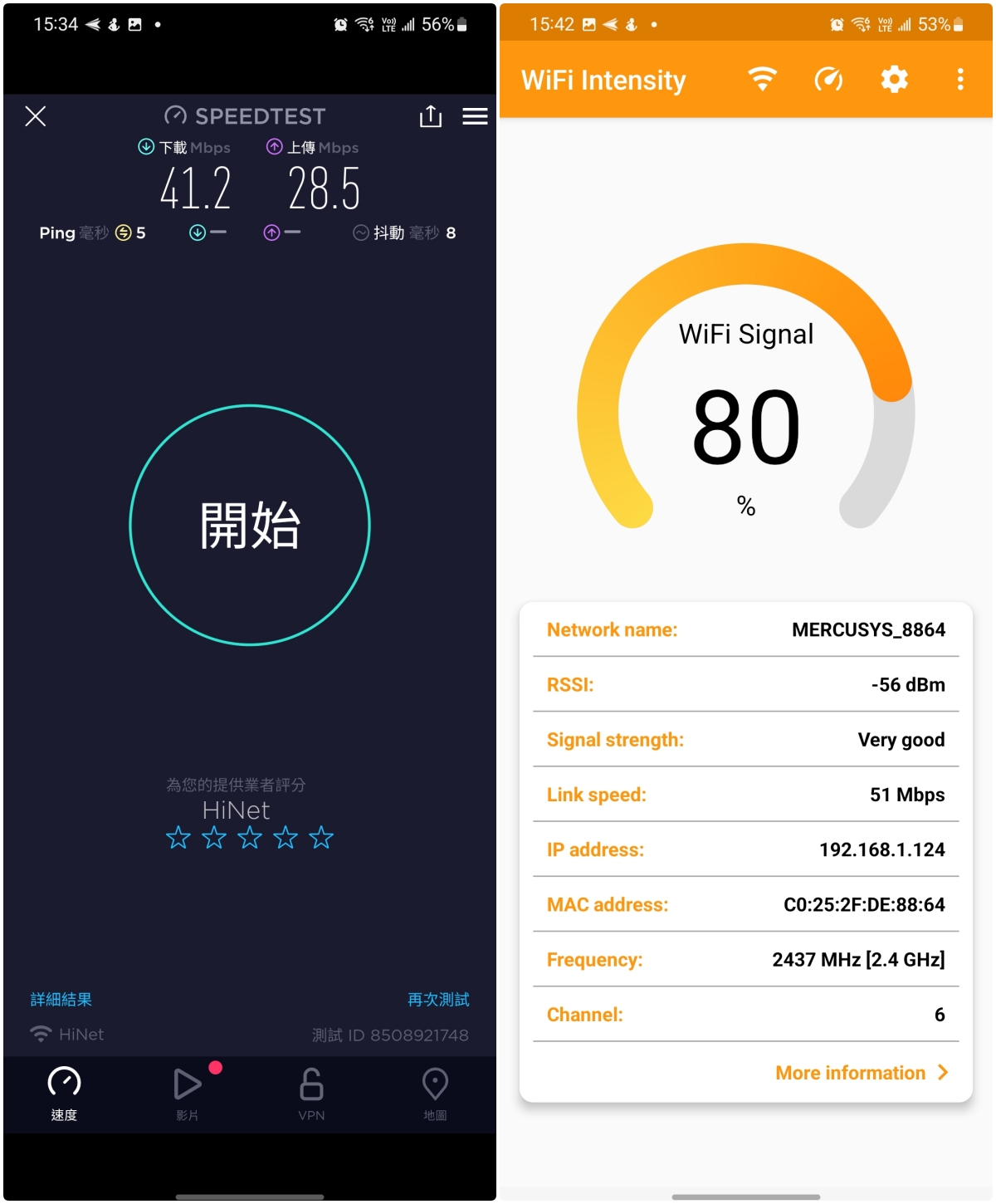 - Wi-Fi 訊號強度:-56dBm