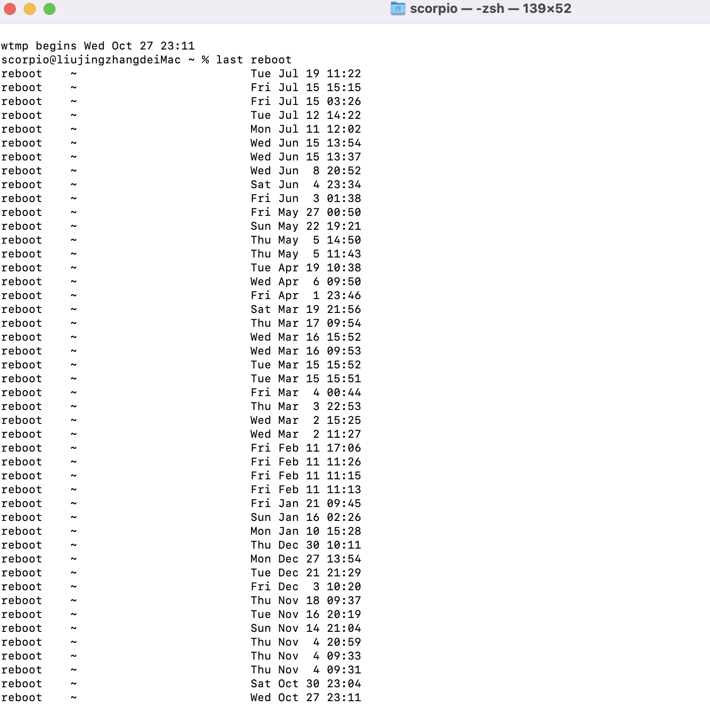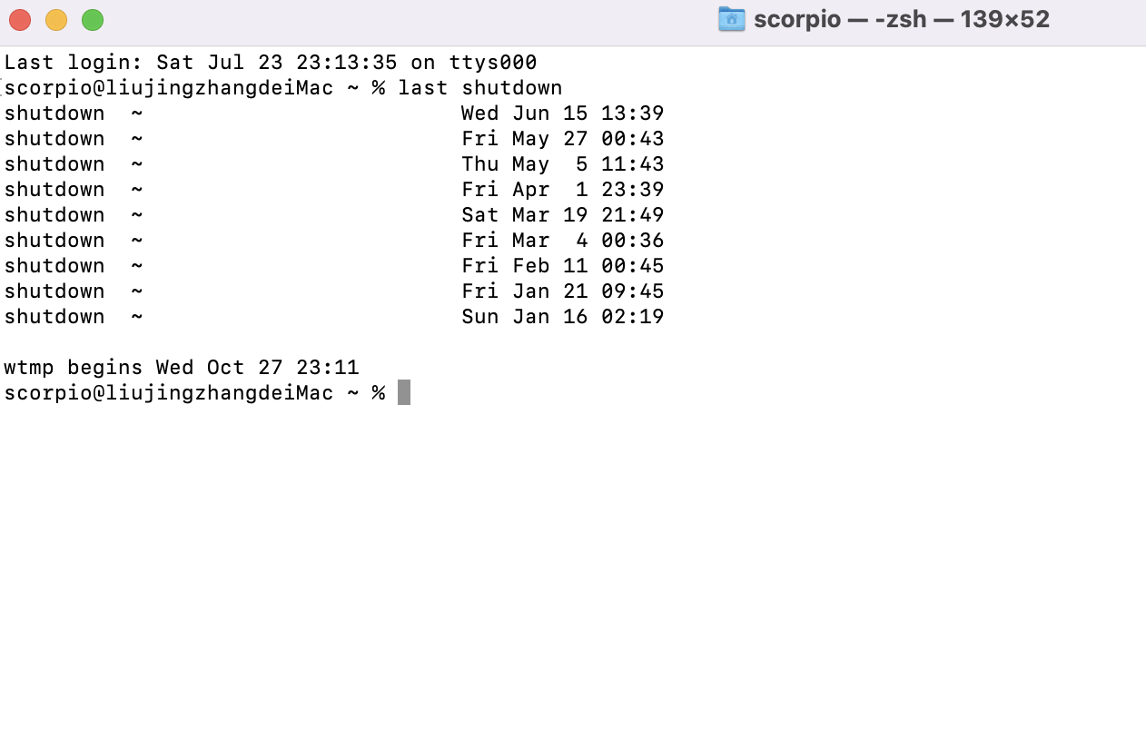 首先是查看關機記錄,什麼時候關過都能看,只要在終端機裡輸入「last shutdown」,就能查看詳細的關機記錄,像我這裡最往前可以查到今年 1/16,我通常只有整線才關機,平常是沒在關機的。