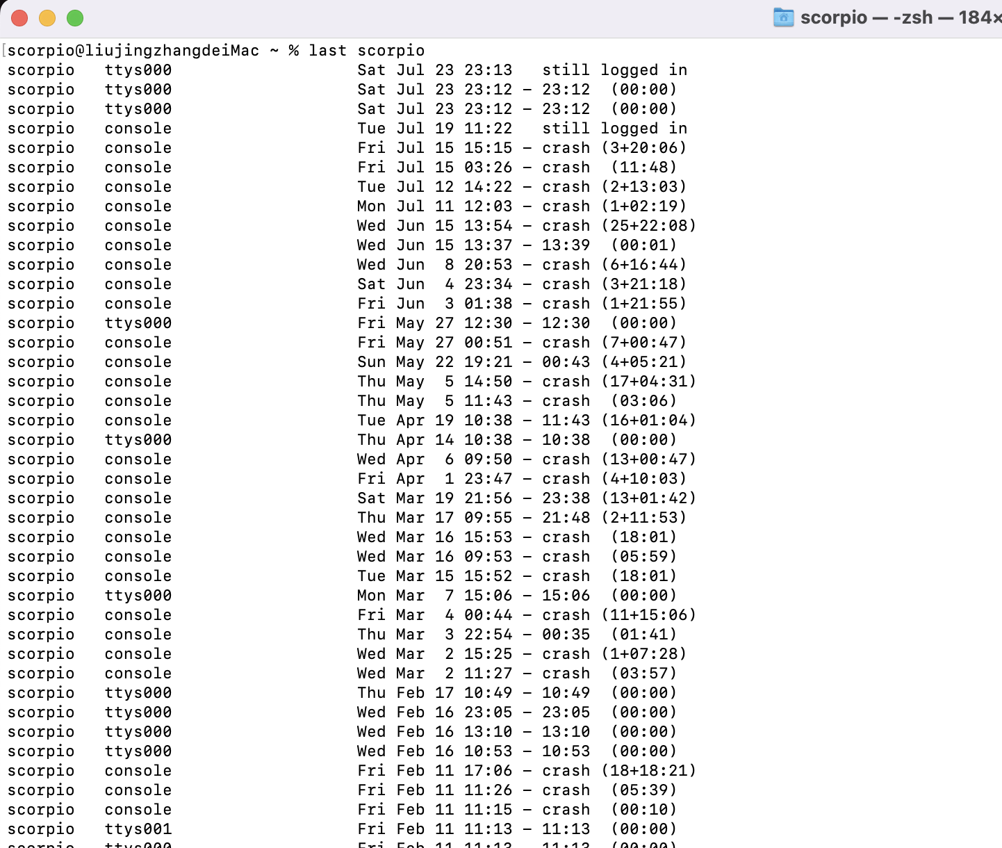 最後一個是查看使用者的登入記錄,指令是「last 使用者名稱」,比如我的是 scorpio,那就是輸入 last scorpio,很簡單吧,快去試試吧。