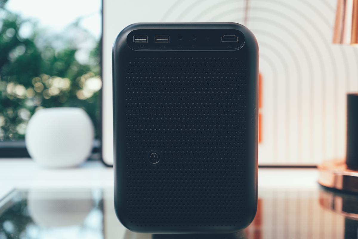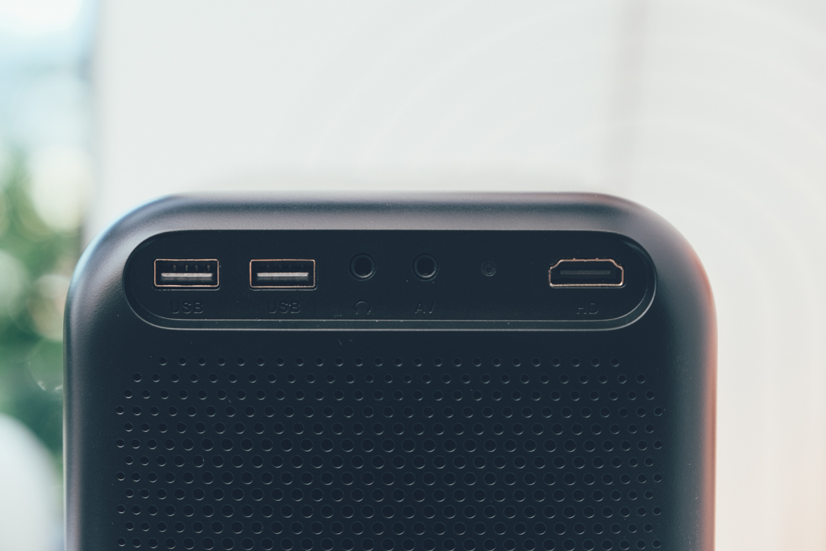 正後方備有二組 USB 用來 USB 隨身碟來讀取內容,另外也有 3.5mm 音源連接埠、AV 端子以及一組 HDMI 外接埠,除了透過內建的系統播放,可以自己準備內容或是外接設備做為一般投影機來使用。