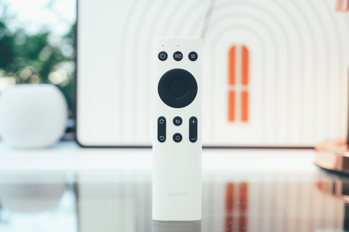遙控器採白色設計,操作簡單明瞭,最上方中間的按鋌還可以切換為滑鼠模式,變成游標移動操作。