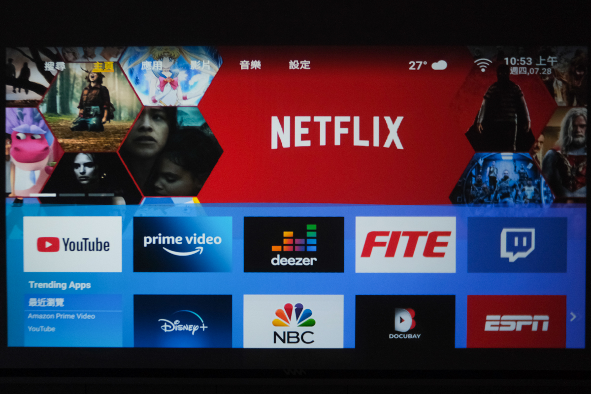 當然,現在投影機的內建功能及內容也非常重要,搭載了 Android 系統的 T6R Max 預載了什麼呢?其實基本最常用的 NETFLIX 、YouTube、Disney+ 都在其中,也能透過應用程式商店額外再安裝更多需要的 APP。