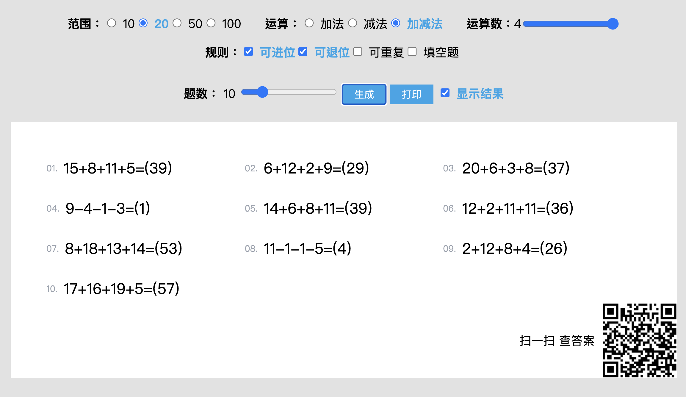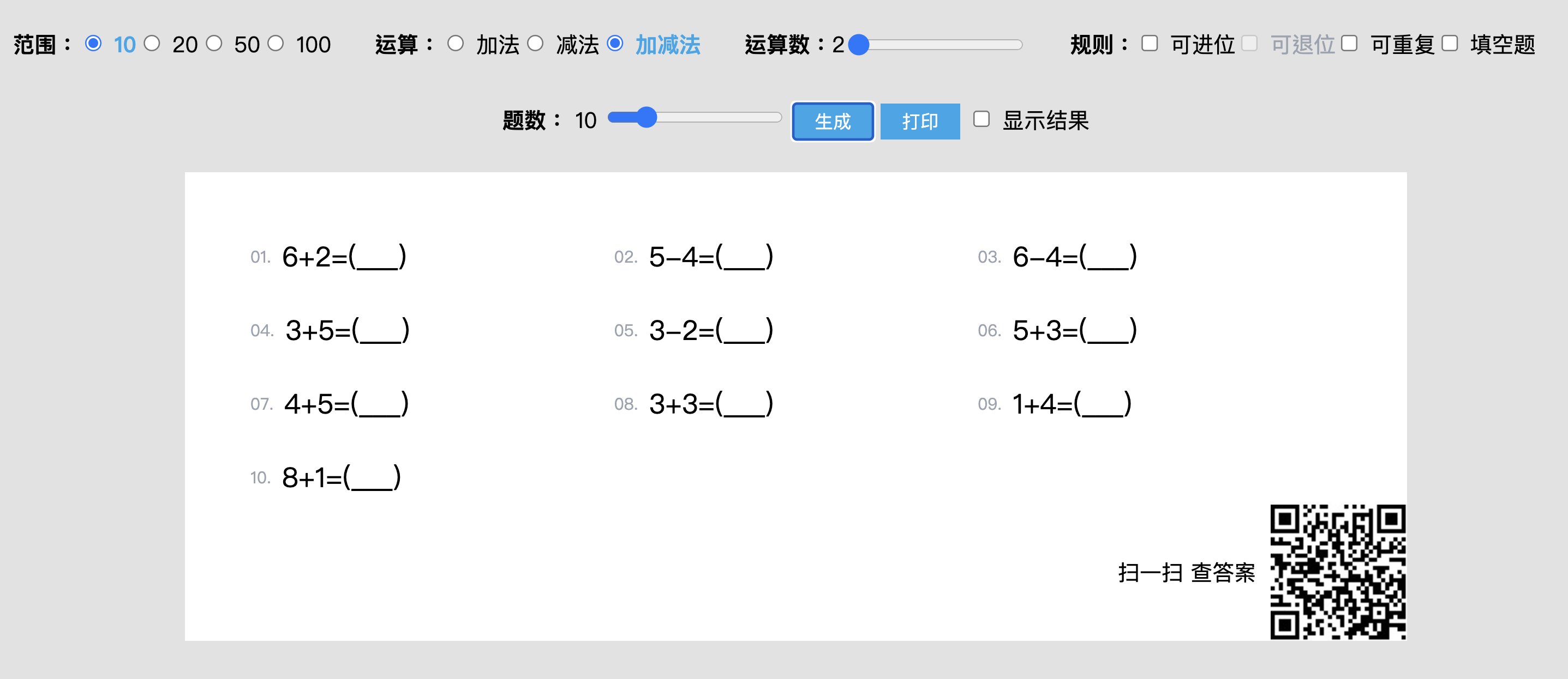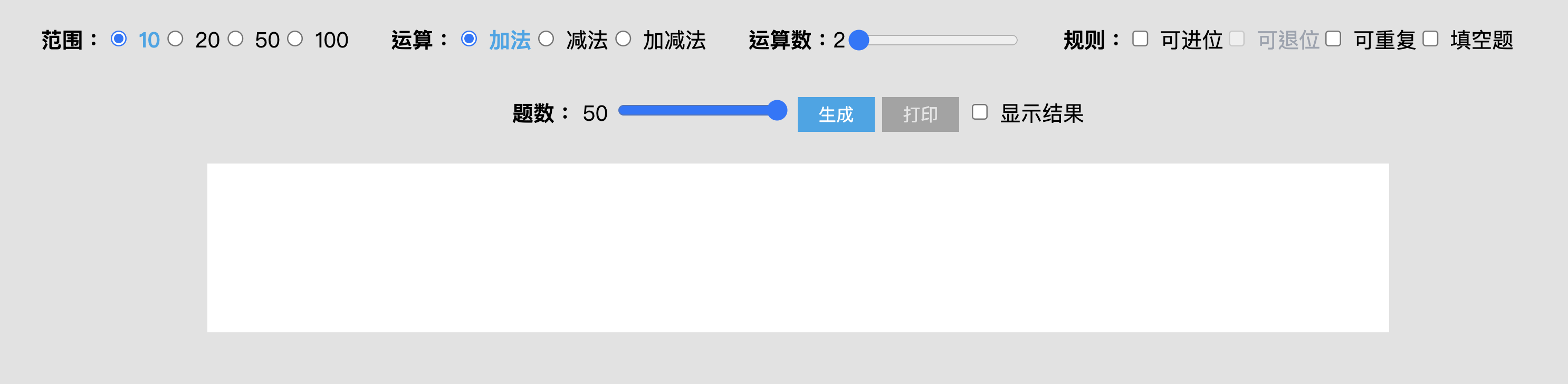 網站:https://nmtuan.github.io/maths/進入網站後,上方可以選擇數字範圍、運算式、位數以及規則,最後再選擇要產生的題數後就可以按下生成。