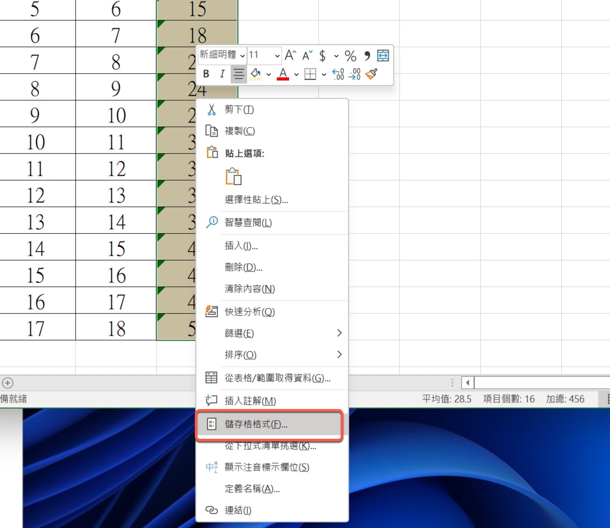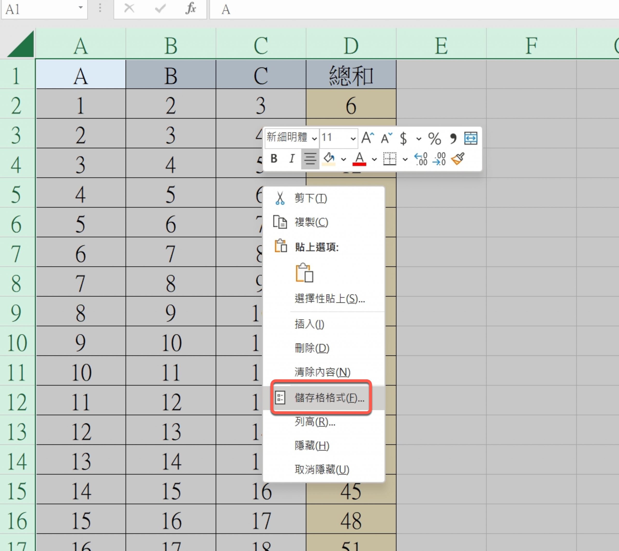 上一個動作就會自動選取全部的公式欄位,這時請右鍵,再進入一次儲存格格式。