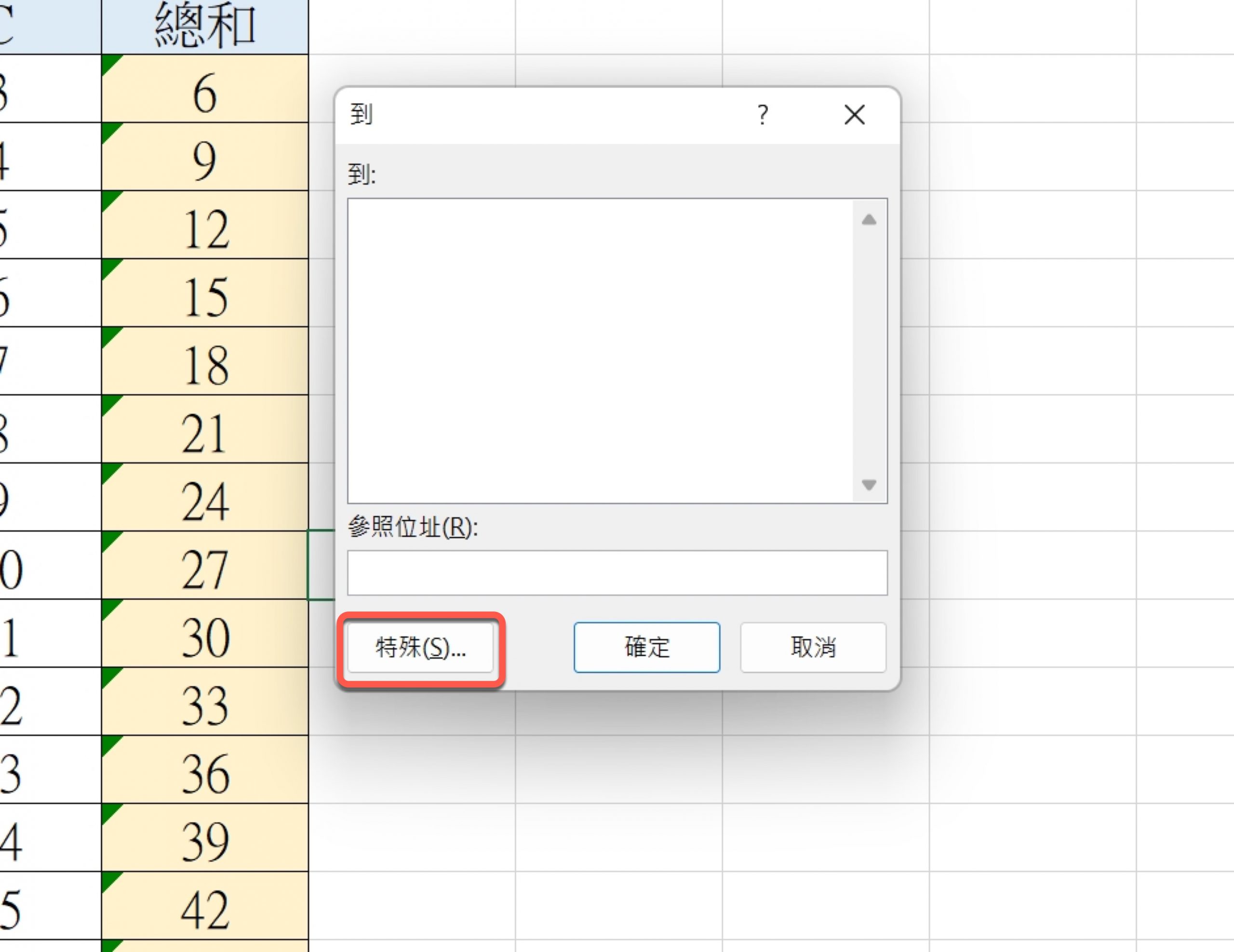 然後隨便點一格欄位後,按下「Ctrl + G」,跳出這畫面後,點擊「特殊」。