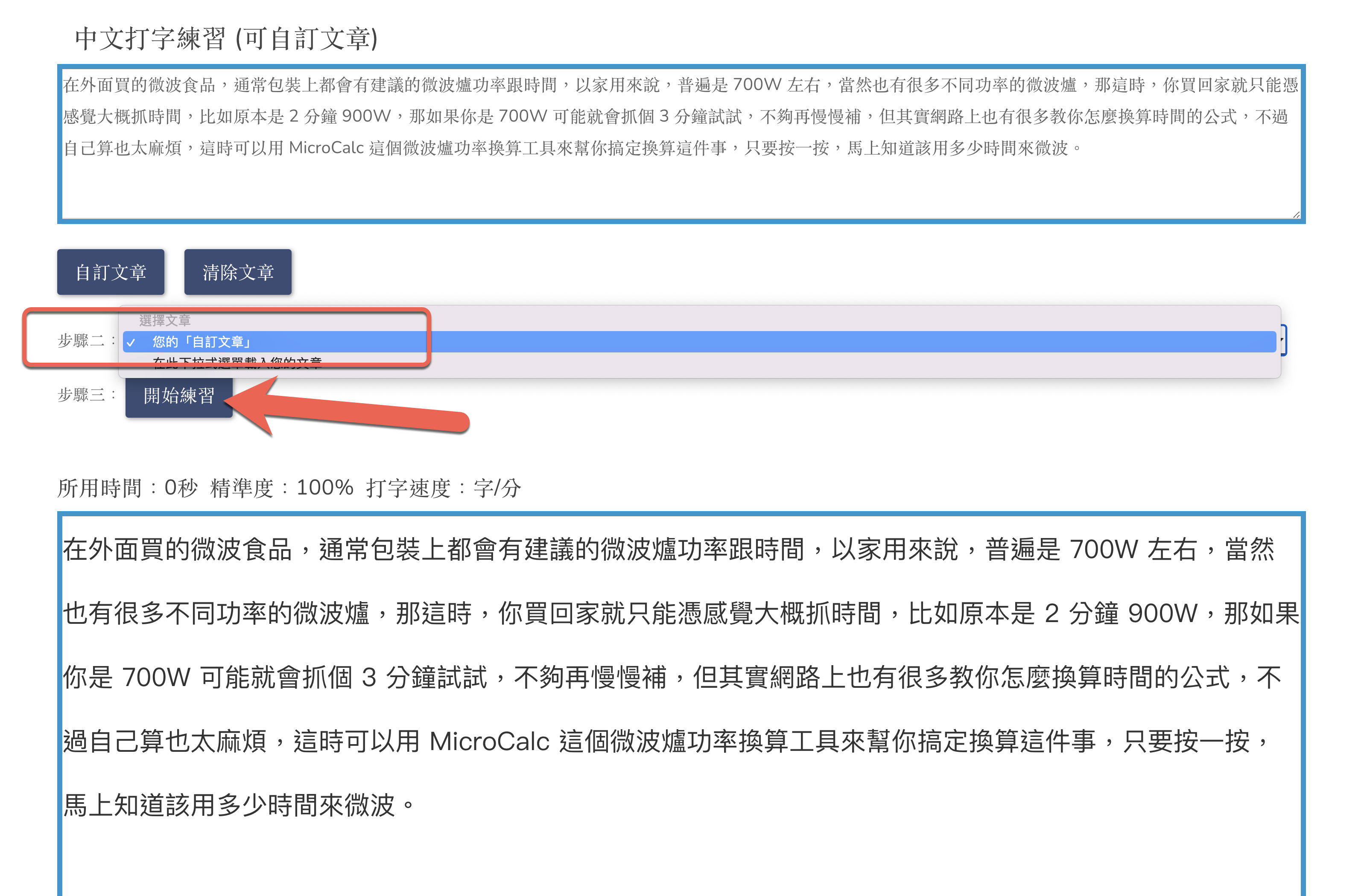 接下來在步驟二的地方就可以下拉選擇您的自訂文字,再按下開始練習,就可以了。
