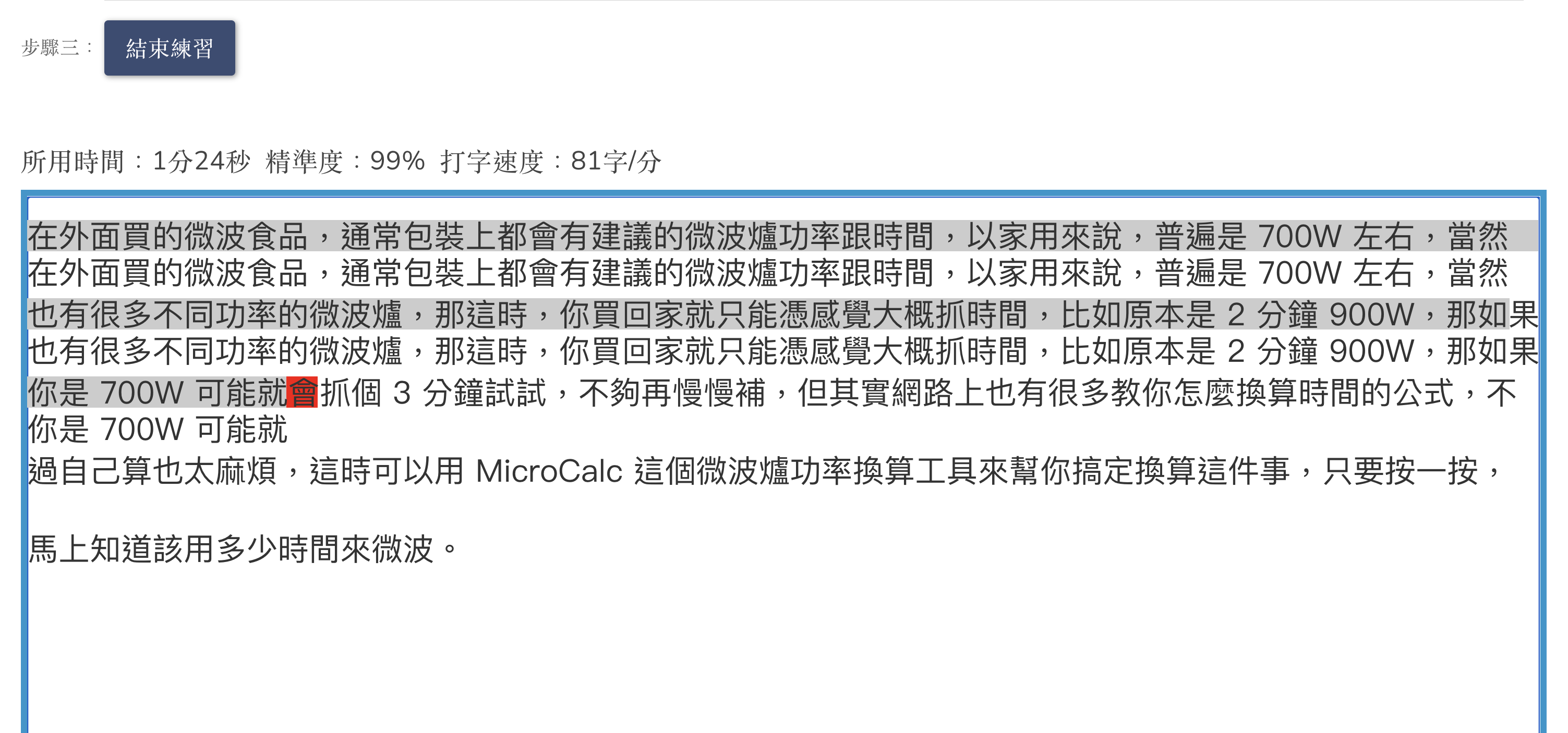 下方欄位按一下後就可以開始打字,邊打字會邊計算你的精準度、打字速度,就這樣慢慢練習,日積月累就會愈來愈快了。