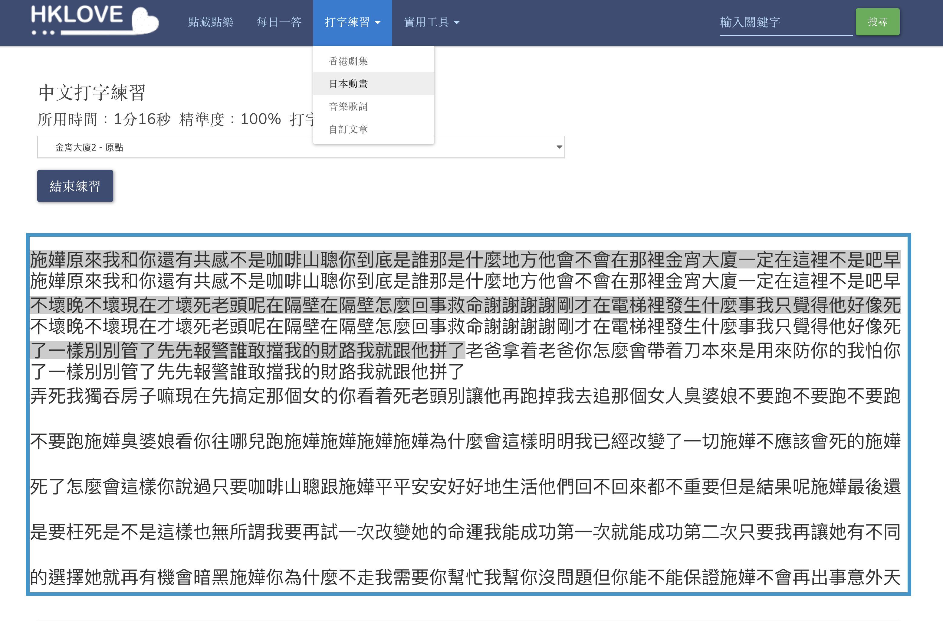 如果你不知道要貼上什麼東西來練習,他上方打字練習下拉,也有香港劇集、日本動畫、音樂歌詞可以選擇,有一些預設的內容直接練習,而且是去掉了標點符號,對入門練習來說是非常不錯的,快去試看看吧。