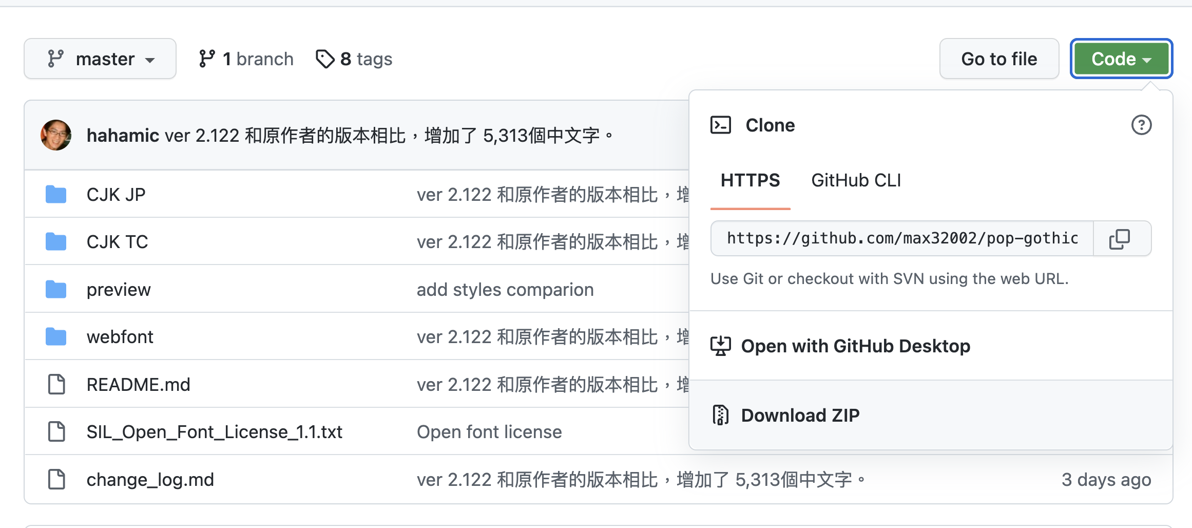 開發作者頁面:https://github.com/max32002/pop-gothic要下載的話,直接進到開發作者頁面,右邊 Code 下拉後點擊 Download ZIP 即可。