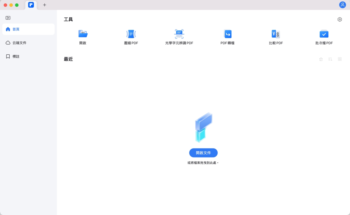 首先在軟體首頁可以看可以看到主要功能包括壓縮 PDF、光學字元辨識 PDF、PDF 轉檔、比較 PDF 及批次處理 PDF,而預預設情況下,直接開啟 PDF 就是進入編輯模式,或是直接將要編輯的 PDF 檔案拖曳到軟體裡面也是可以的。