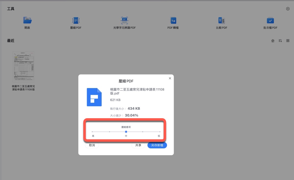 PDFelement 除了最重要的 PDF 編輯功能外,比如像 PDF 壓縮功能也很不錯,阿湯選了中等的壓縮能力,預估後可以減少 30% 的容量,真的差蠻多的,而且比對後,壓後的檔案,內容完全看不出來有什麼品質失真的狀況。