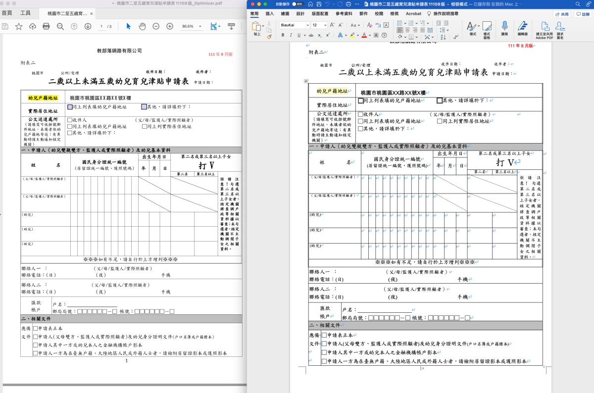 在 PDF 的製作中,就跟 Word 一樣,其實都是可以製作出勾選核取方塊、下拉選單、複選方塊等,只是很多人在製作時都只有用個方框,等於你一定要列印出來填寫,不方便預填一些內容,這時你可以將舊有的方框刪除,使用新的核取方塊來取代。