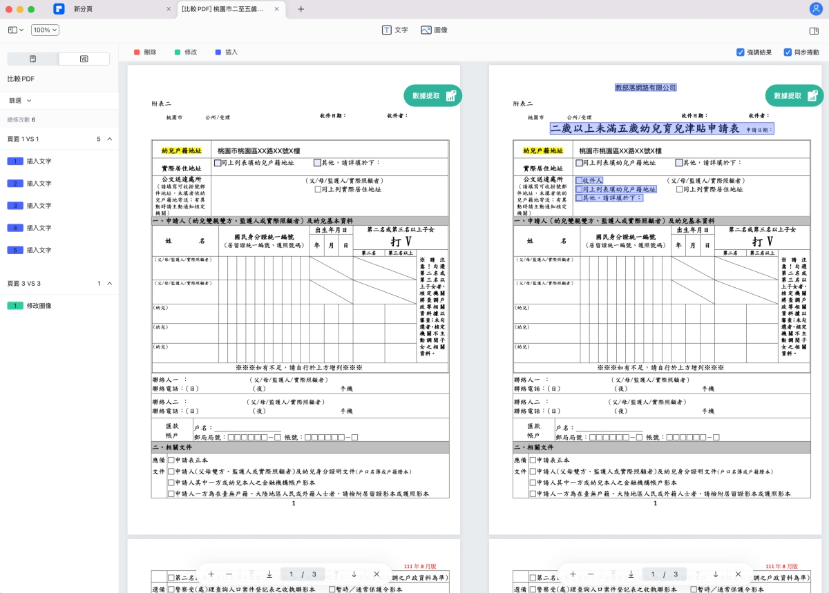 PDF 比較功能,阿湯也覺得非常實用,直接匯入二個 PDF 檔案,就會直接標示不同的地方,因此如果你想要比對二份文件不同之處,那就直接用它來查看,一秒就現形啦。