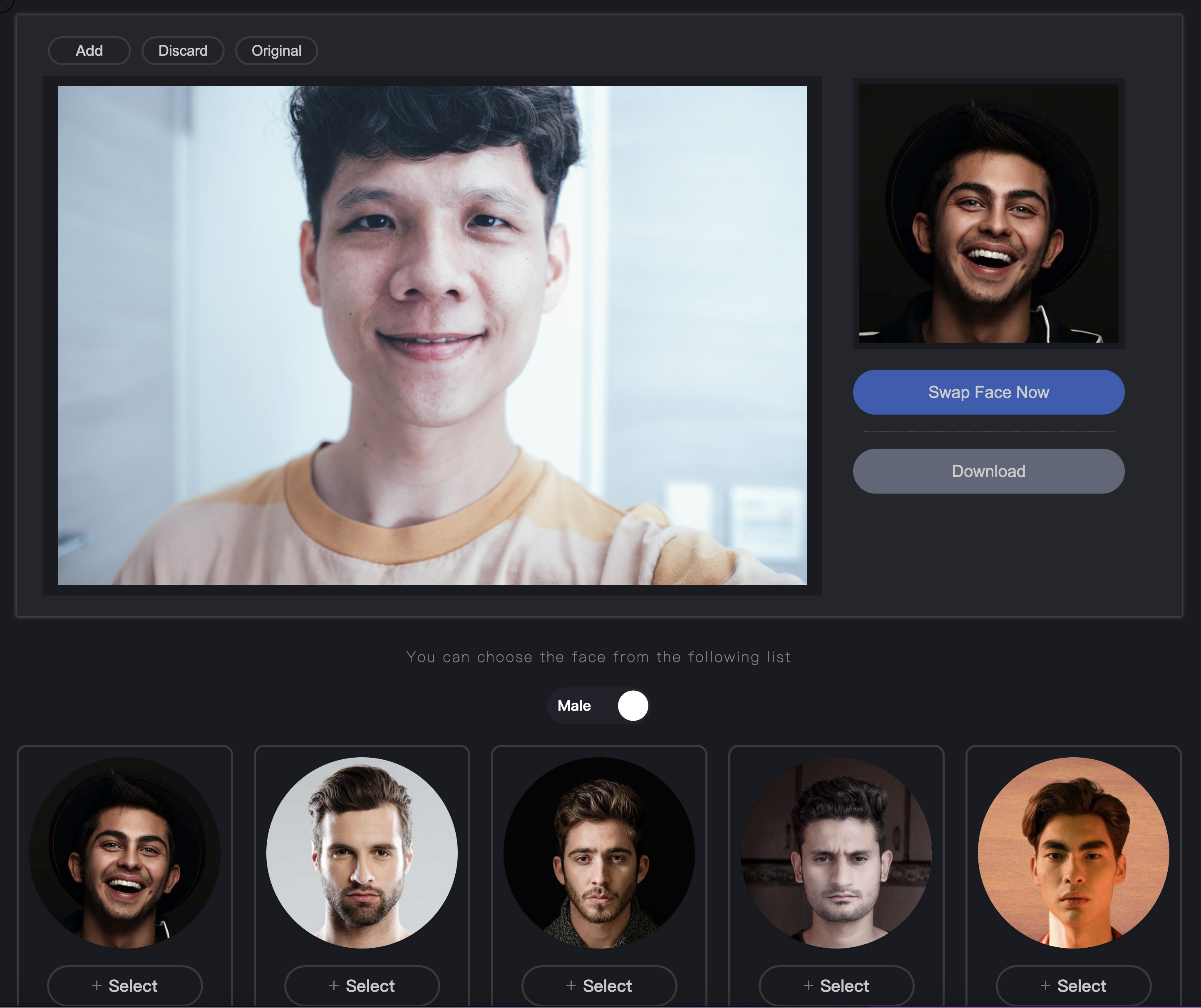 接下來就可以在下方選一張想要合成的人物,或者也可以自己上傳,不過伺服器似乎是蠻忙碌的,自己上傳的失敗率還蠻高的,很容易卡住,大家想玩可以先試試現有提供的就好。
